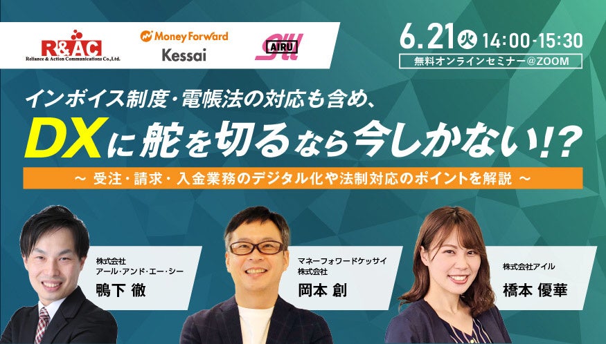 法人向けの入金消込・債権管理システムを開発・提供する株式会社アール・アンド・エー・シー(本社:東京都中央区、代表取締役:高山知泰)と、株式会社アイル(本社:大阪市北区・東京都港区、代表取締役社長:岩本哲夫)、マネーフォワードケッサイ株式会社(本社:東京都港区、代表取締役社長:冨山直道)は、2022年6月21日(火)に、インボイス制度・電子帳簿保存法への対応をきっかけに業務のデジタル化を検討されている事業者さまに向けて、「インボイス制度・電帳法の対応も含めて、DXに舵を切るなら今しかない!?~3社で事例のクロストーク、DXや法制対応のコツやポイントをお話しします~」オンラインセミナーを無料で開催します。