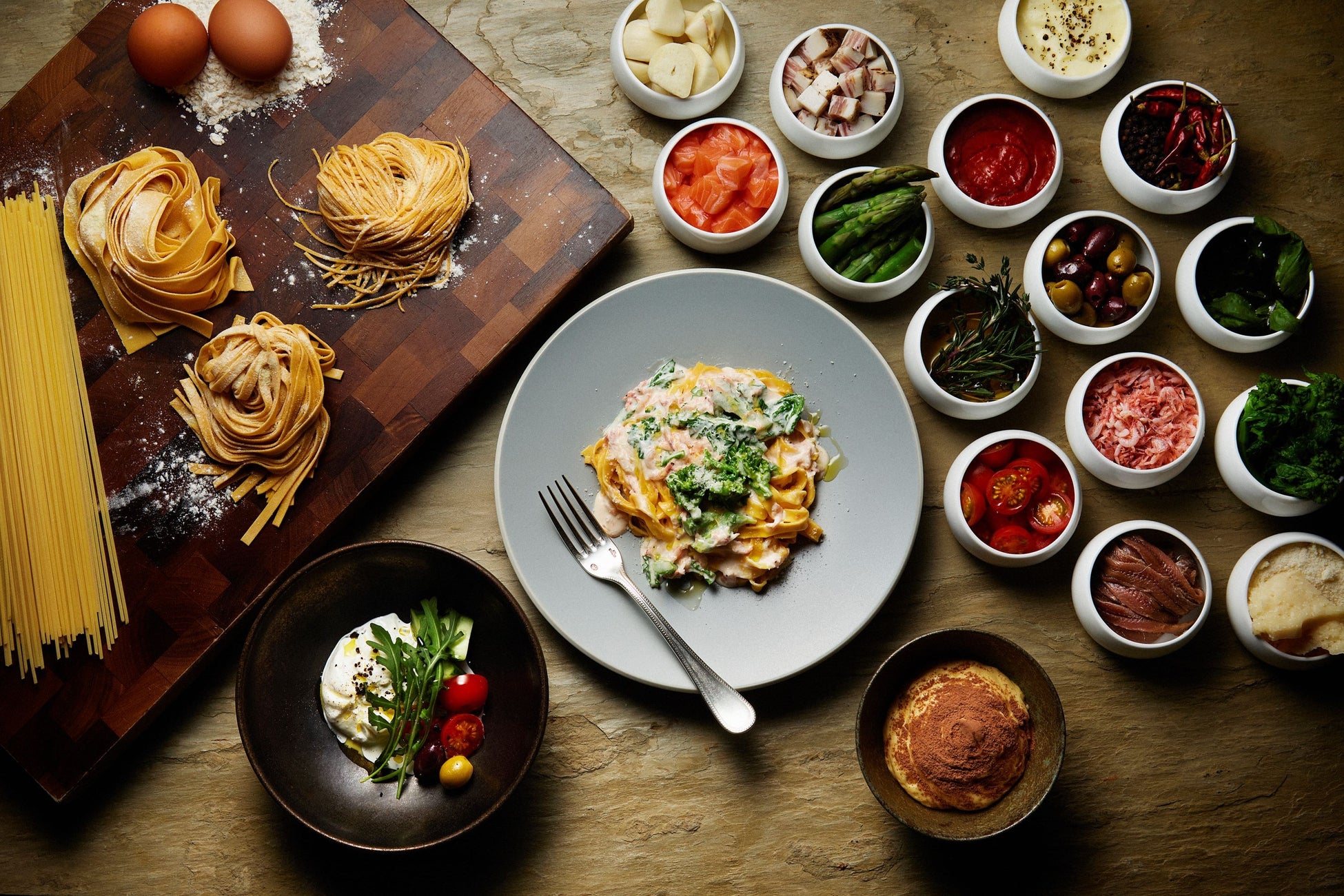 ザ・ロビーラウンジで提供するのは、お好みのパスタ、ソースをそれぞれ3種類から、トッピングも2種類を選んでシェフと作り上げるカスタマイズ「パスタランチセット」。9パターンにも変化するパスタにトッピングが加わっておいしい組み合わせが広がる、迷いながらも心躍るランチタイムをお過ごしいただけます。パスタもソースも、常時3種類ご準備いたします。タリオリーニ(細め)、タリアテッレ(平麺)の国産小麦の手打ちパスタのほか、スパゲッティも。トマトやバジル、ボンゴレに醤油ベースの和風などソースもその日の気分に合わせて、または相性の良い組み合わせをご友人と相談しながら、塩漬けした豚ほほ肉や熊本県産桃太郎サーモン、北海道のホタテ貝に春の菜の花、富山県産ホタルイカなど、トッピングを組み合わせて完成させたひと皿で、午後からの活力をチャージするのはいかがでしょうか。