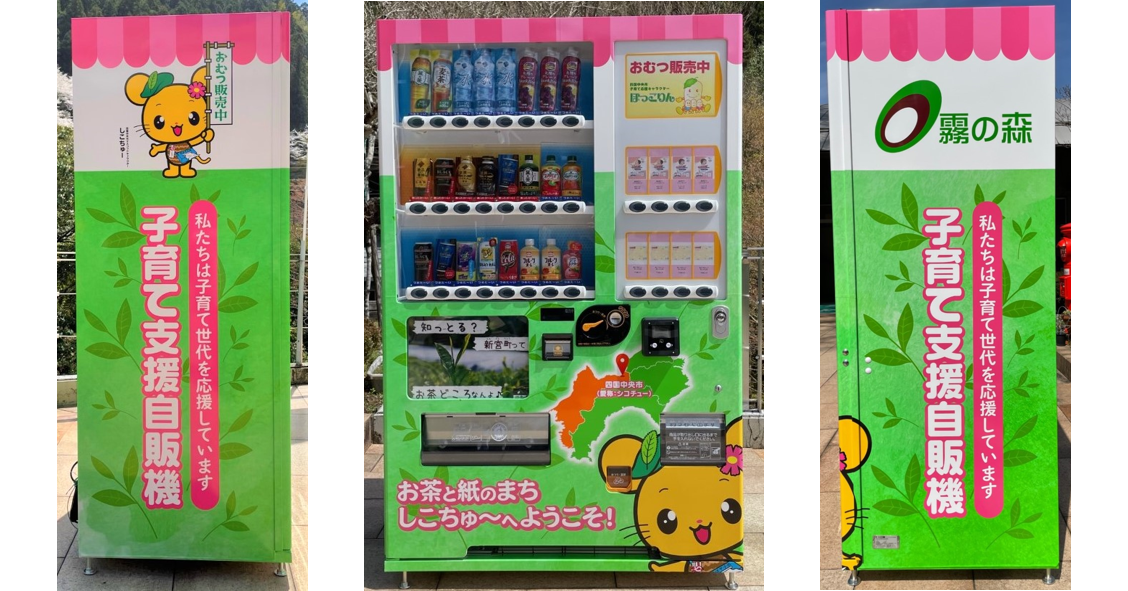 本自販機は、四国中央市が掲げる子育て応援事業「あったかしこちゅ~」の一環として、お子様連れで来場される方に、安心して施設を利用していただくことを目的に企画したもので、飲料とともに、ベビー用 紙おむつの小パック(2 枚入り)やおしりふきシートを購入することができます。なお、四国中央市内において、初めての設置となります。