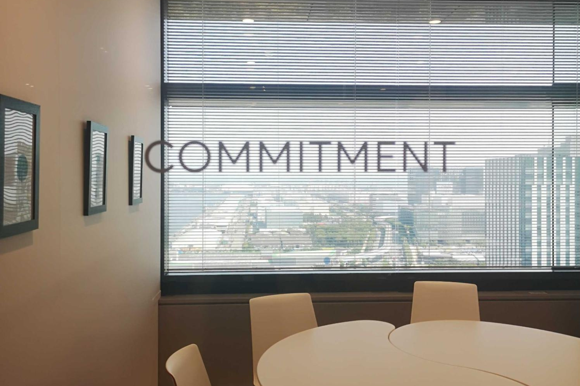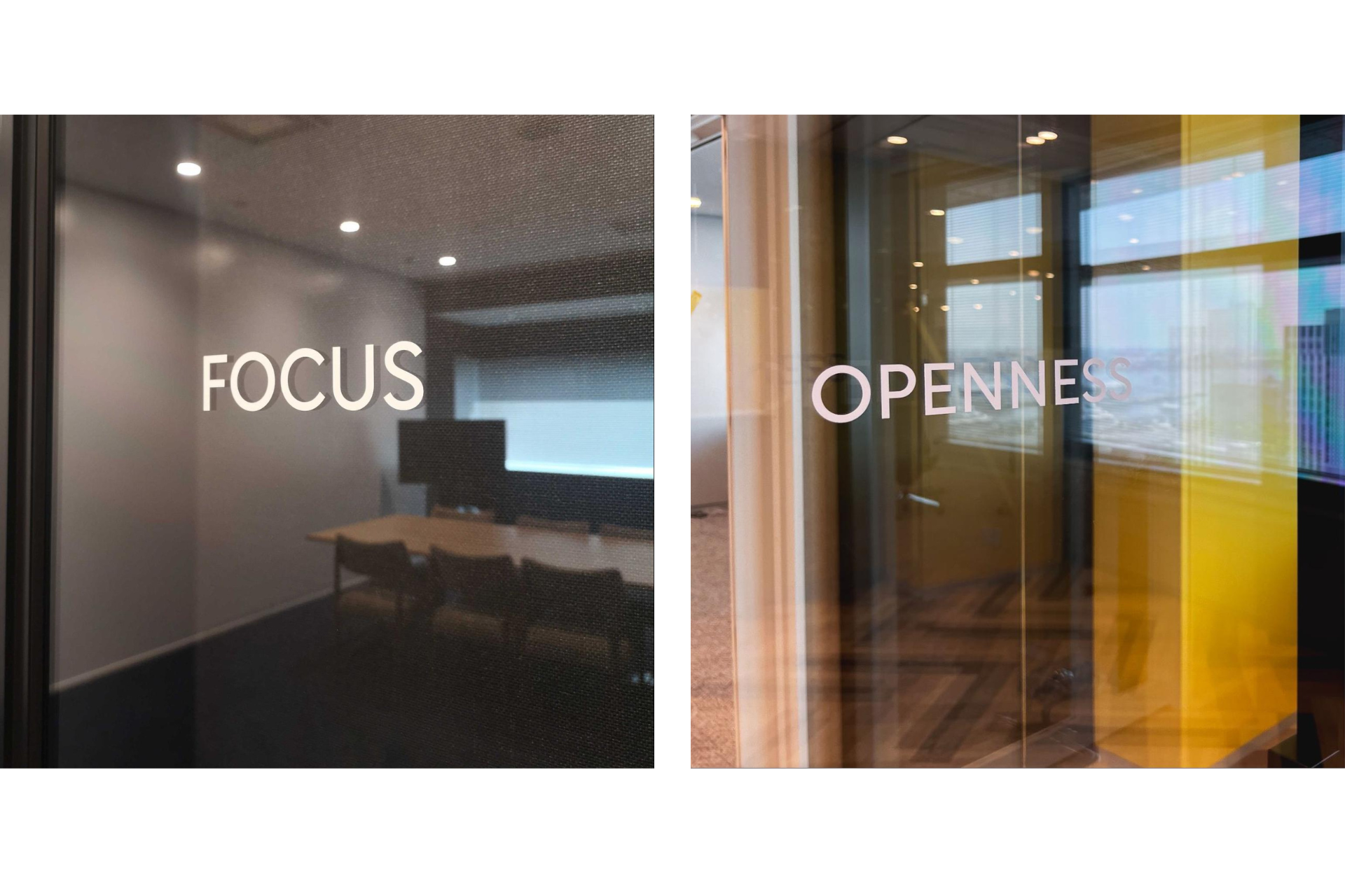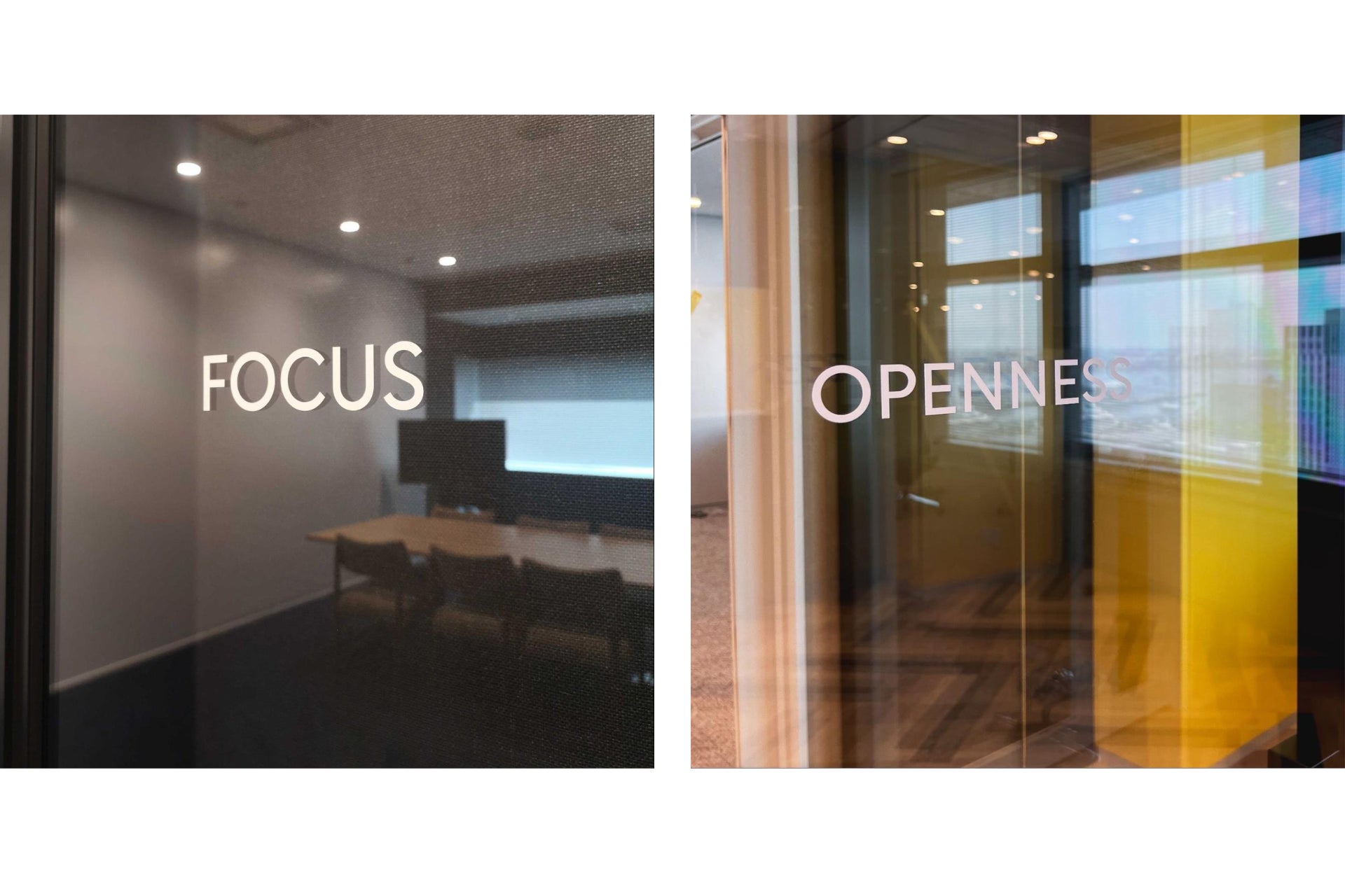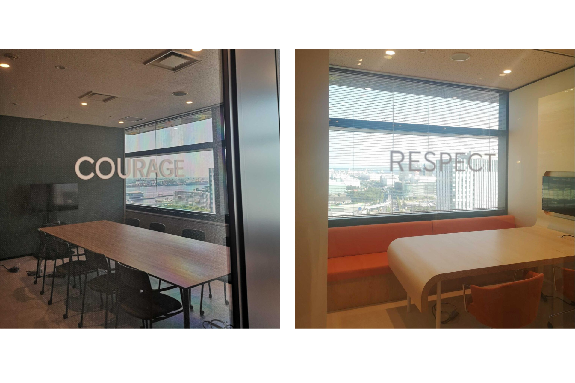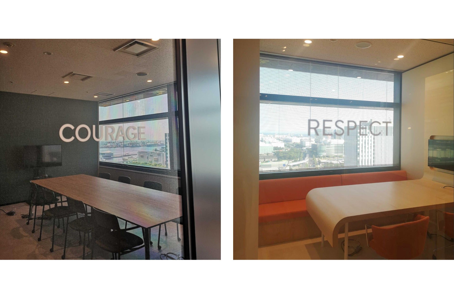 社内外とのコミュニケーションが生まれる会議室には、創業当初から大事にしているアジャイルの価値観でスクラム手法の大事な5つの価値基準「確約」「勇気」「尊敬」「公開」「集中」を具現化した会議室をつくりました。