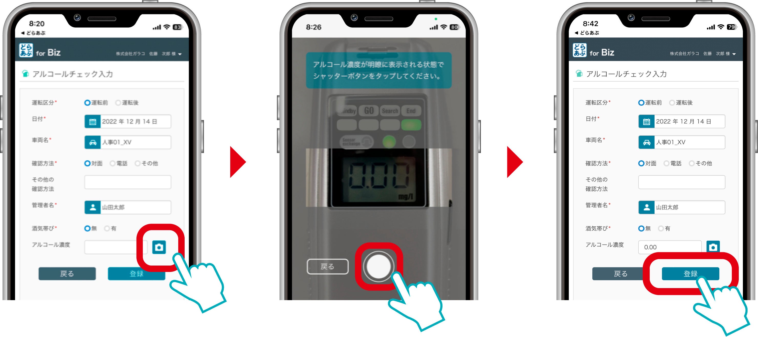 運転前後にアルコール検知器による検査結果をスマートフォンで記録する際の数値入力のミス防止や負担軽減を実現するOCR機能を搭載しました。様々な種類の検知器に幅広く対応しています。