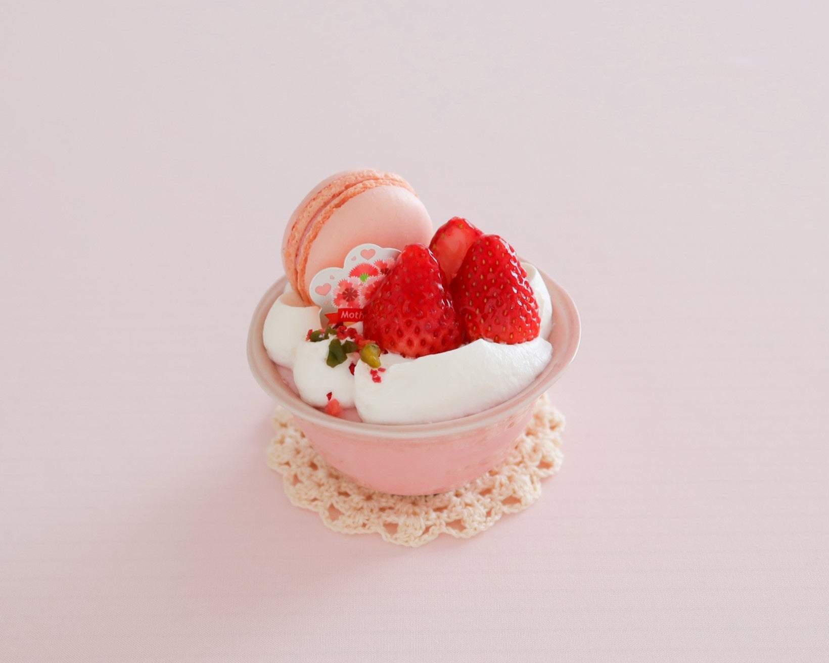 ジューシーな苺のムースに、人気のマカロンを丸ごと飾った、母の日のカップデザート。