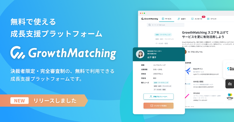 GrowthMatchingは企業の成長に必要な支援を幅広く無償で提供いたします。