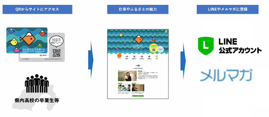 高校卒業生全員に地域の魅力を発信するウェブサイトのQRコードを記したカードを配布し、LINE、メルマガ登録を促進し、潜在的なU・Iターン層とのつながりを維持するとともに、各種SNSと連動し、静岡県で暮らし働くことへの興味・関心を促す情報を随時提供するなど故郷が忘れ去られない取組を行っている。