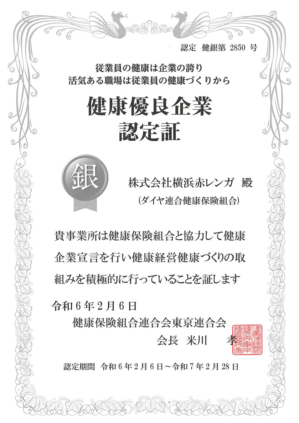 株式会社横浜赤レンガ(本社:横浜市、代表取締役 岩﨑 求起(以下、当社))は、2022年12月に健康保険組合東京連合会へ「健康企業宣言」を行い、健康経営に向けた職場づくりや環境整備等の取り組みが評価されたことから、この度、2024年2月に「健康優良企業 銀の認定」を取得いたしました。