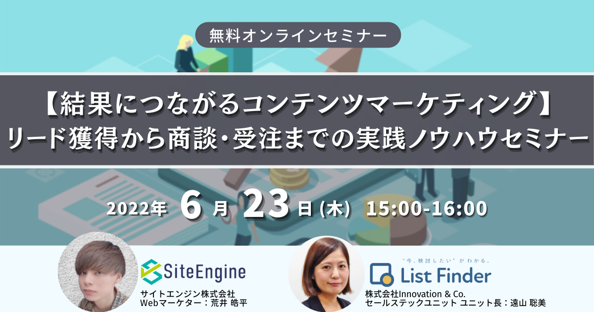 「改善のタネを広める」を経営理念としてWebマーケティング支援サービスを提供するサイトエンジン株式会社(本社:東京都世田谷区 代表取締役:毛塚智彦)は、2022年6月23日(木曜)15:00~16:00に、株式会社Innovation & Co.(本社:東京都渋谷区 代表取締役:遠藤俊一)との” 【結果につながるコンテンツマーケティング】リード獲得から商談・受注までの実践ノウハウセミナー” を開催します。
