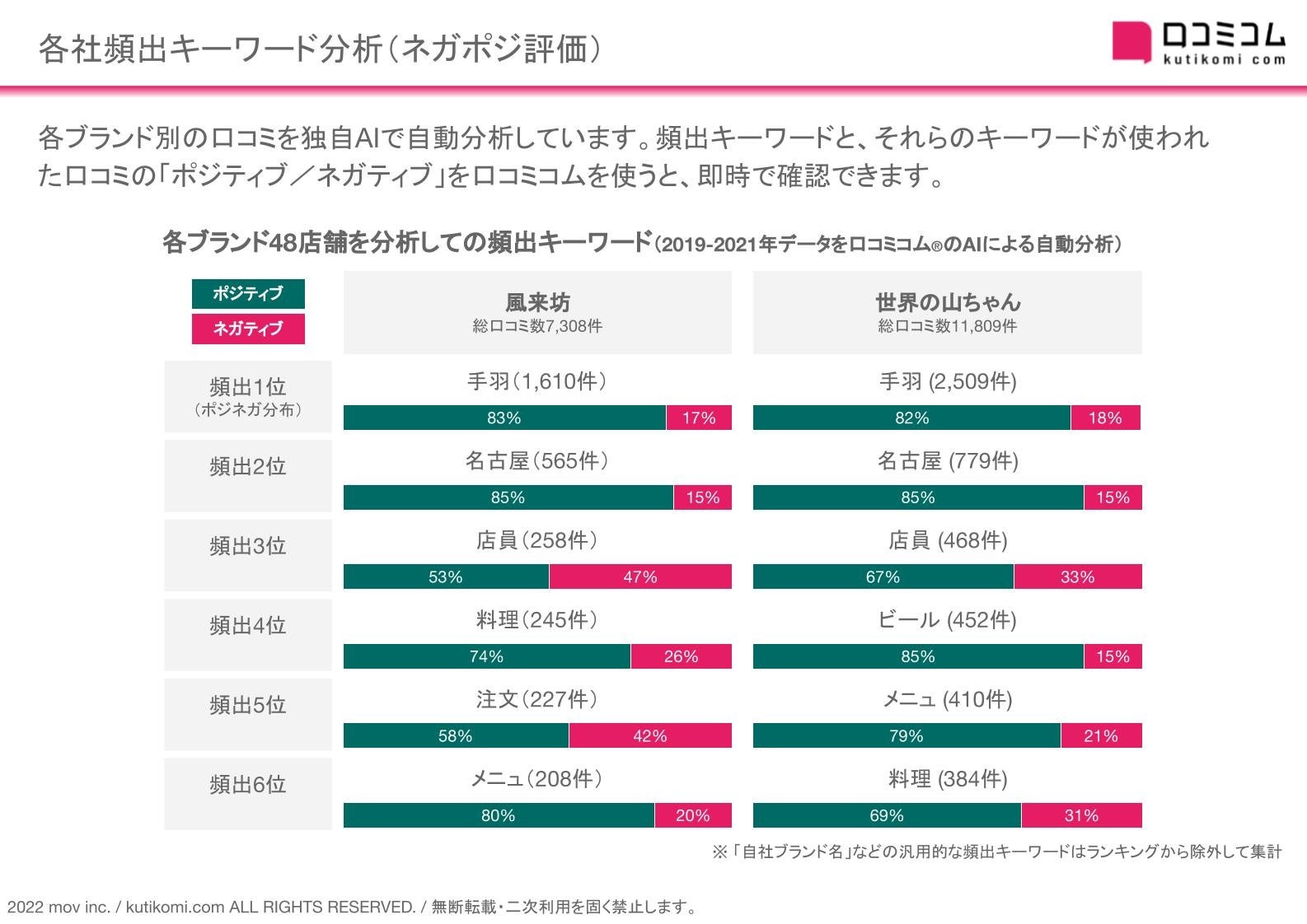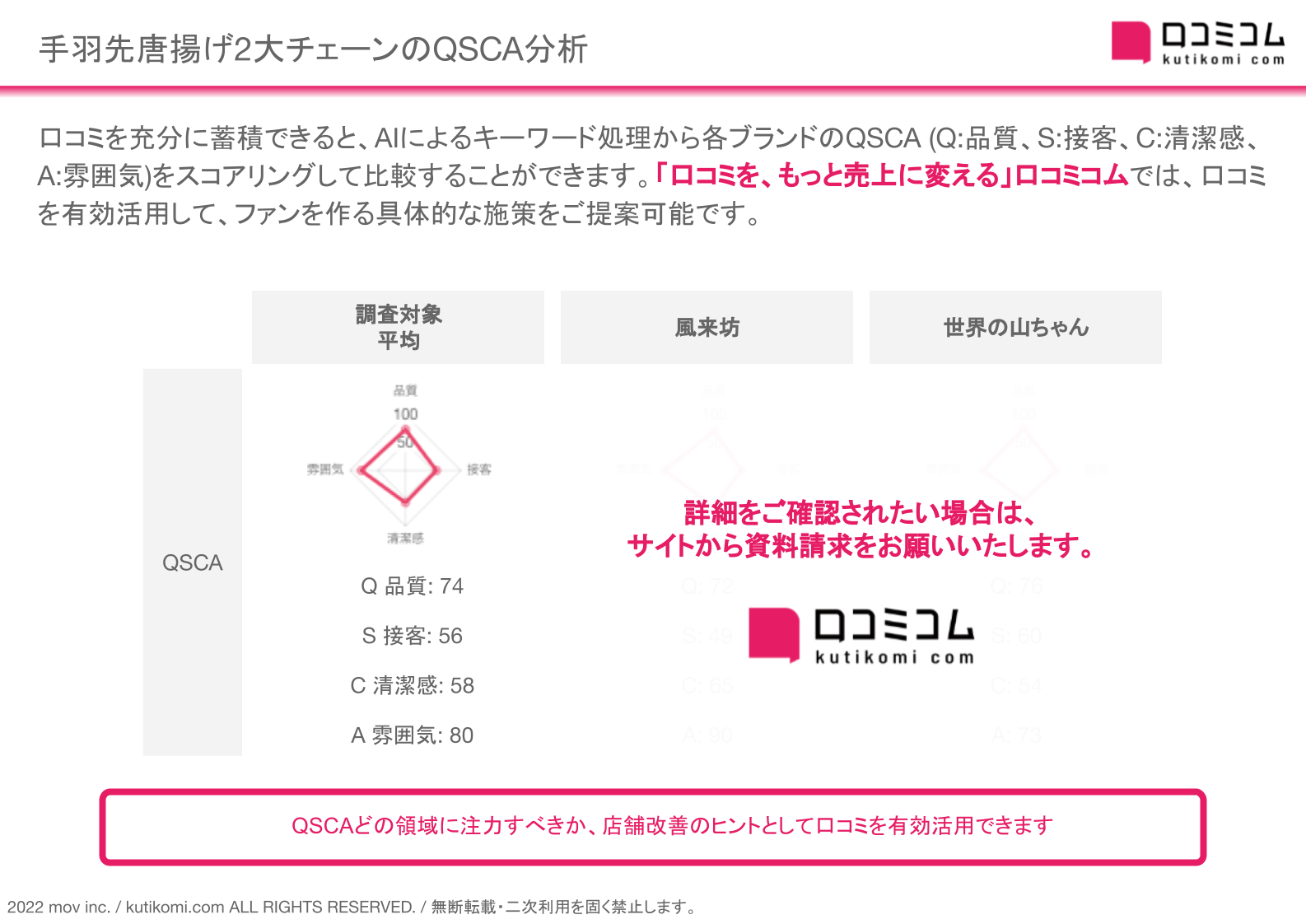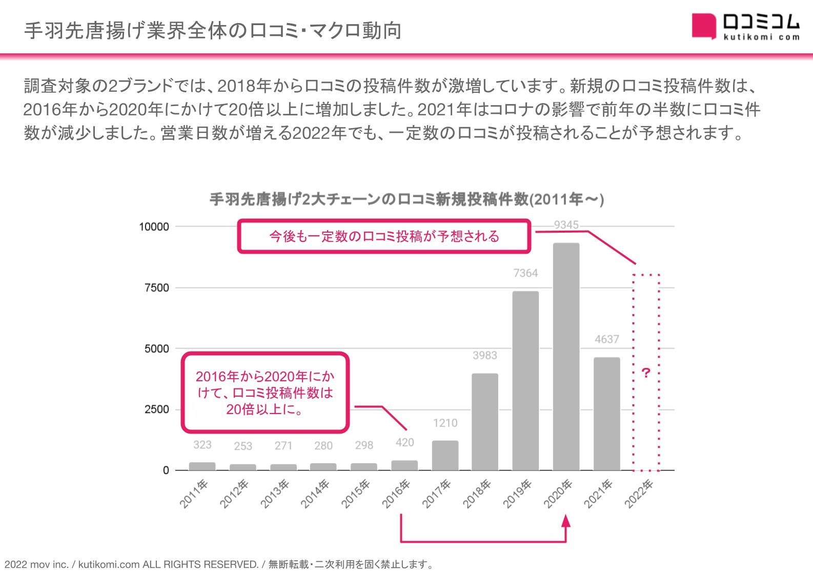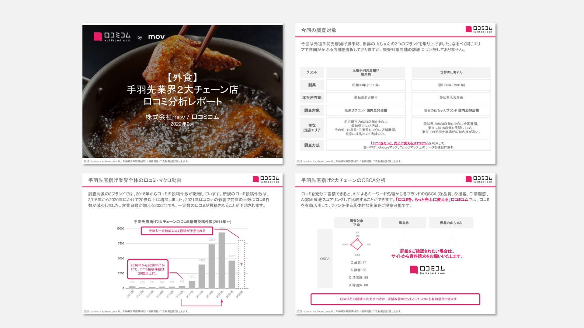 お客様の声のDXサービス「口コミコム」を運営する株式会社mov(代表取締役:渡邊 誠、本社:東京都渋谷区、以下mov)は、「口コミコム」独自の「分析機能」を用い、業界2大チェーン店を対象に「手羽先唐揚げ業界」の口コミ分析レポートを作成しました。