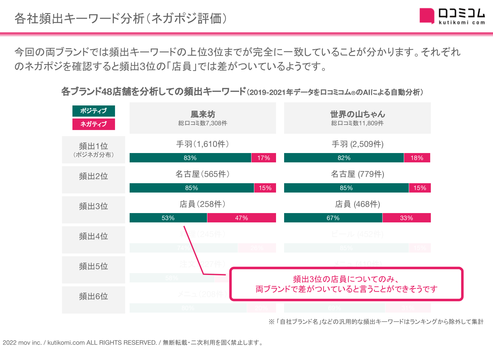 また、各社の口コミを口コミコムの独自AIで自動分析、特定のキーワードにおけるポジティブ・ネガティブ率を判定したところ、2社の差は「店員」のキーワードに表れています。