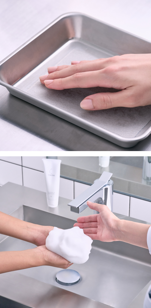 落とす・洗う・ 整える・うるおす の乾燥を防ぐために必要なスキンケアステップや量、温度 、時間、手の圧(タッチアップ方法)などを、お手元で体験いただけます