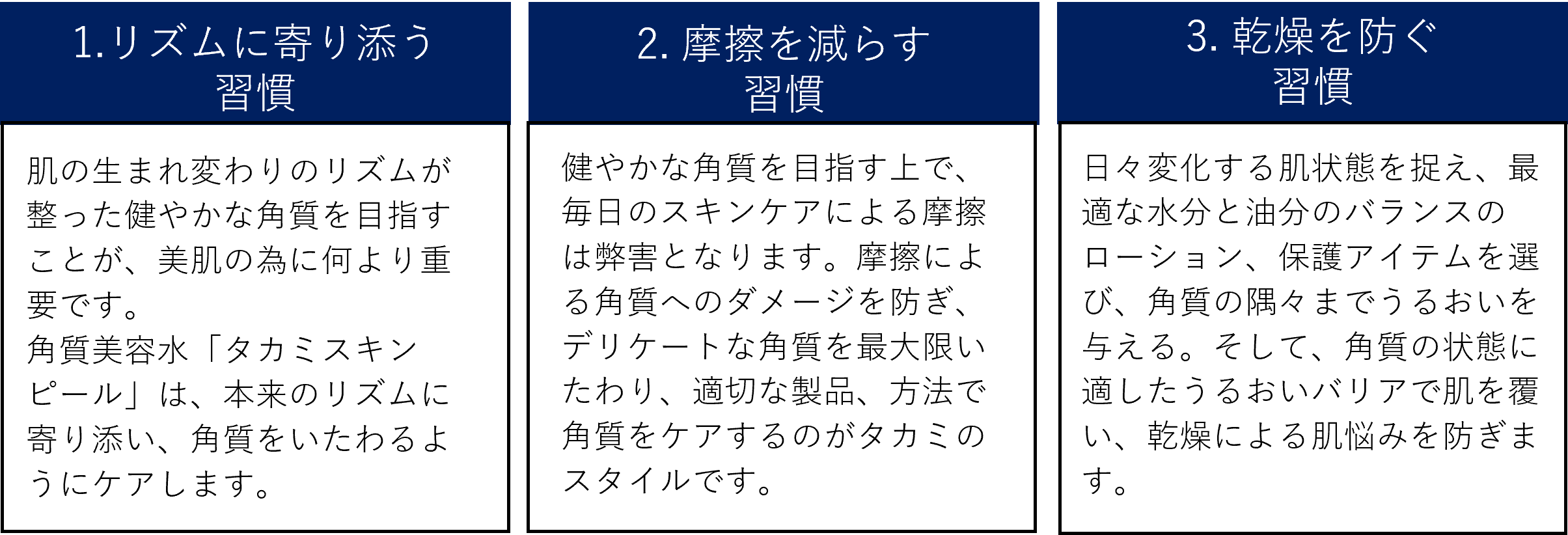 タカミの製品ラインナップは、3つの習慣を全て実現するために開発され、効果を追求するだけでなく、テクスチャーにいたるまでこだわりぬき、美しさを丁寧に育む習慣を特徴づけています。また製品だけでなく、角質と向き合い手のひらで究める、“摩擦レス・使用量・温度・時間”にこだわったケア方法までに至るソリューションがタカミ“角質美容Ⓡ”です。これを学び、実践することで肌が美しくなる成功体験を重ねていただけます。