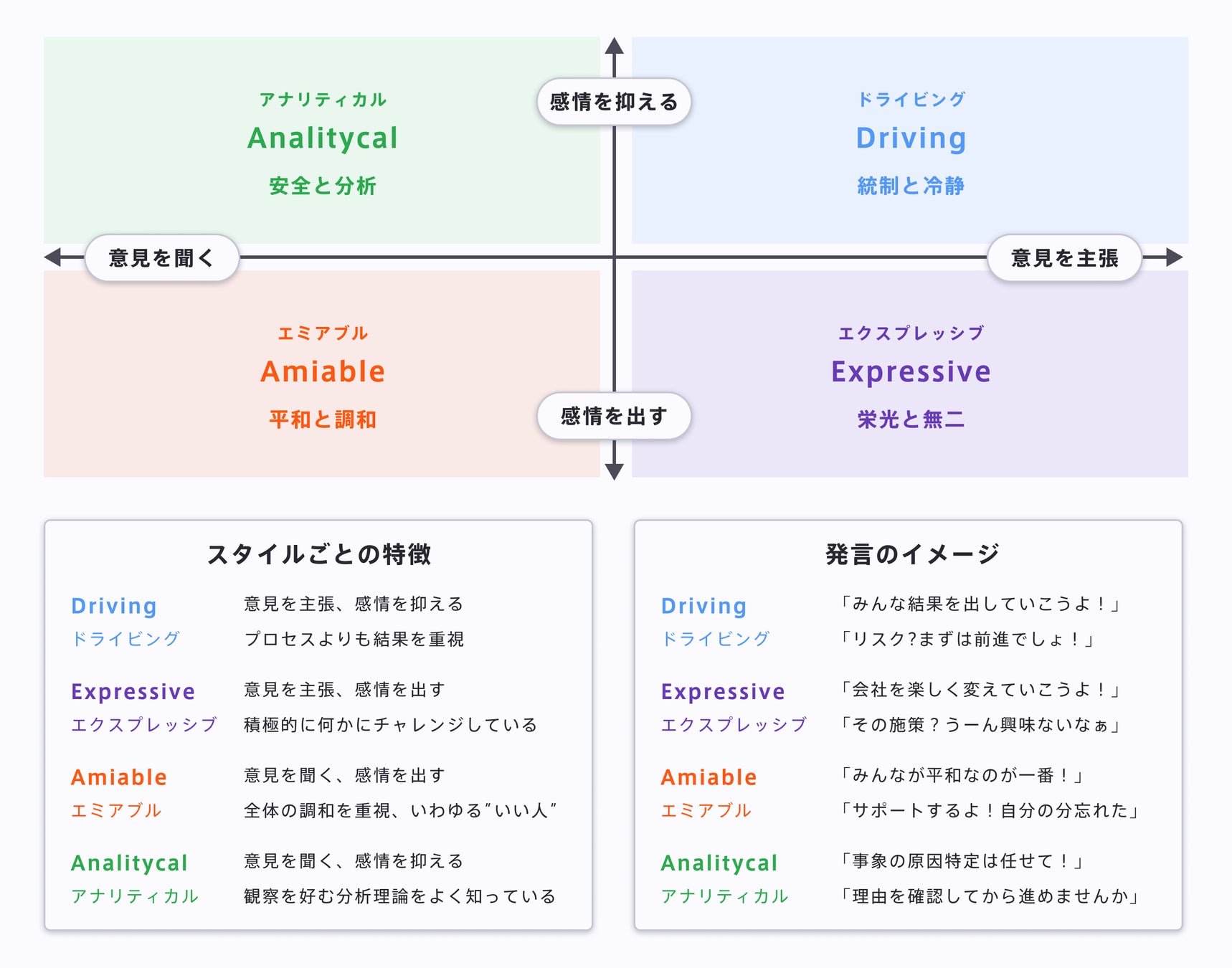 ソーシャルスタイル理論とは、1960年代に提唱されたコミュニケーションの理論です。人の言動である感情表現の強弱、意志主張の強弱によって、人材を4つのスタイルに分類し、各スタイルに適したコミュニケーションを行うことで円滑なコミュニケーションが行える理論として、様々な企業の教育研修などにも用いられています。人事業務や心理学の知識に疎い現場の管理職の方でも使えるシンプルな理論です。