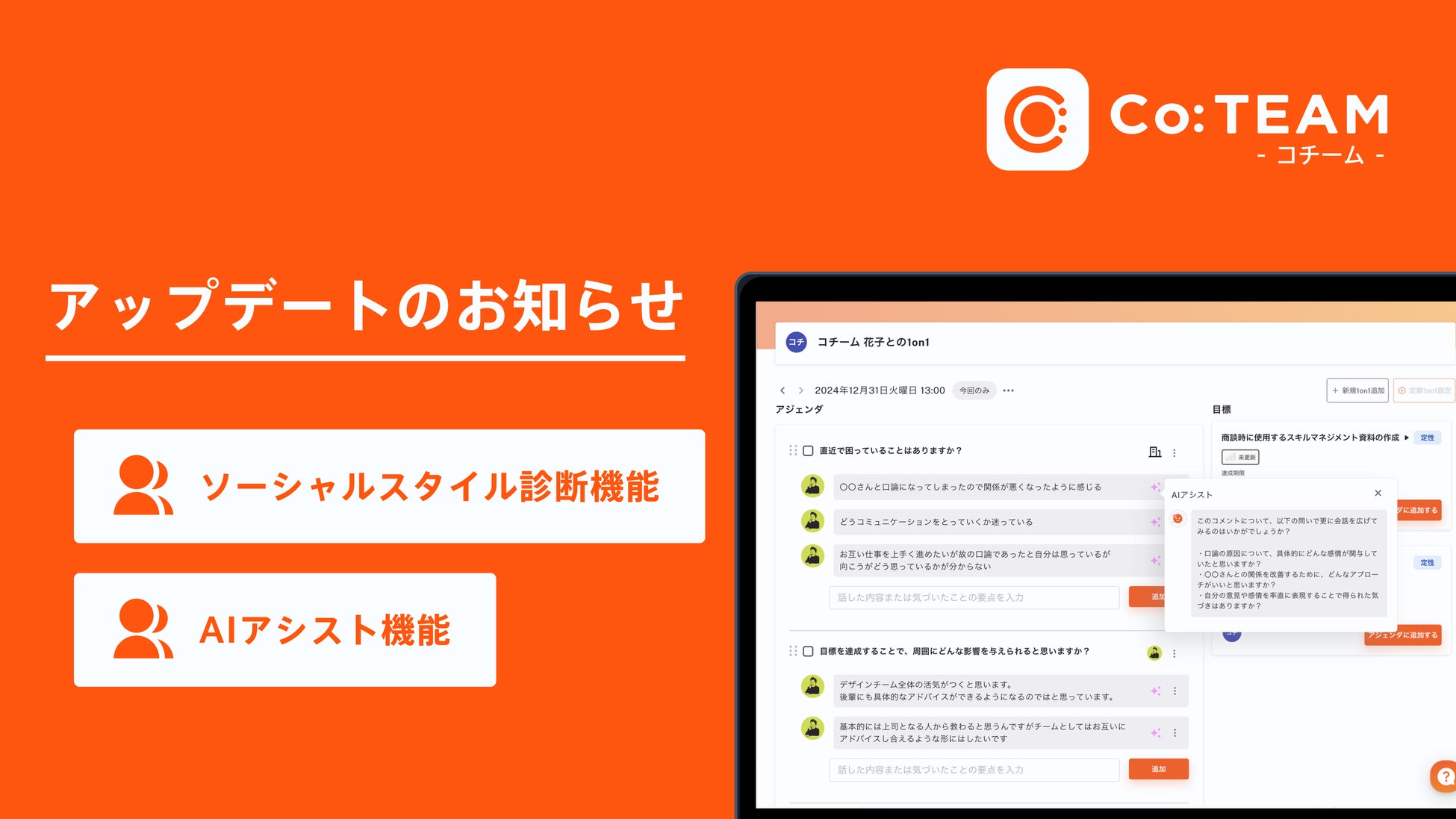 パフォーマンスマネジメントツール「Co:TEAM(コチーム)」(以下、コチーム)を運営する株式会社O: (オー)(本社:東京都杉並区、代表取締役CEO:谷本 潤哉)は、2024年10月7日(月)に「コチーム」に新たな機能としてAIアシスト機能とソーシャルスタイル診断機能を追加したことを発表しました。