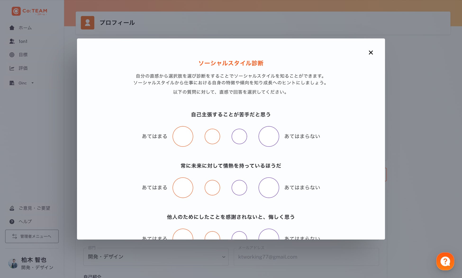 ソーシャルスタイル診断機能は、コチームのツール内で、20問の簡単な質問に答えることでソーシャルスタイルの4タイプのどれに該当するのかを診断します。