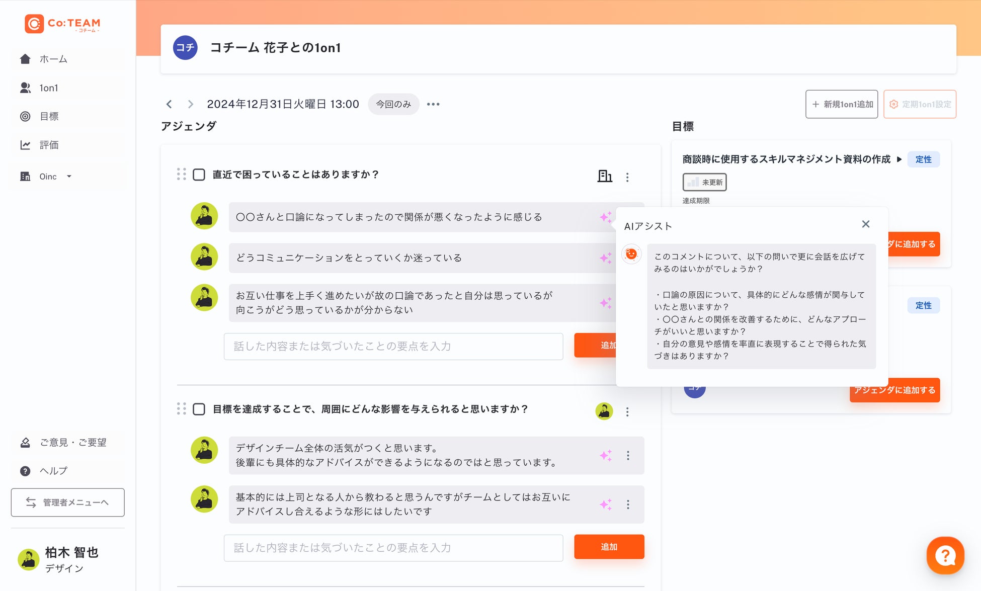 この機能により、コミュニケーションが促進され、効果的な1on1ミーティングを実現することが可能です。
