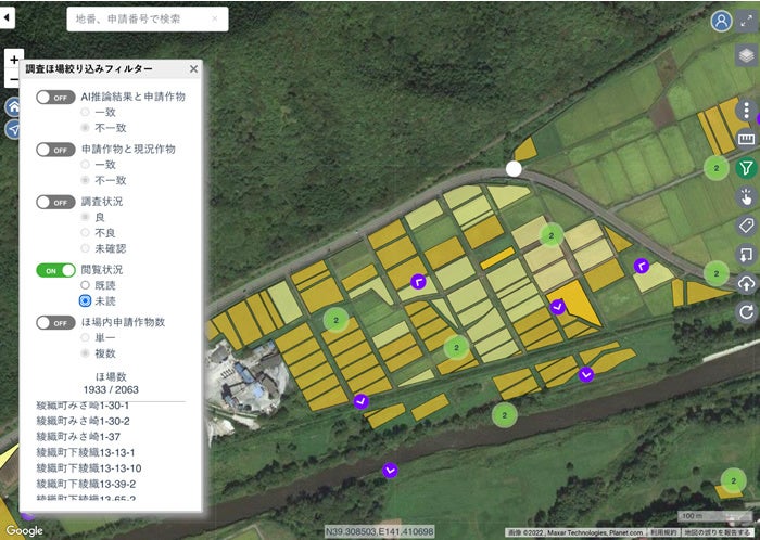 調査エリアが広大な場合、調査状況の確認が大変になります。調査状況の「良・不良・未確認」、閲覧状況「既読・未読」、申請作物と現況作物「一致・不一致」などのフィルター機能を搭載することで、圃場の絞り込みが容易になりました。