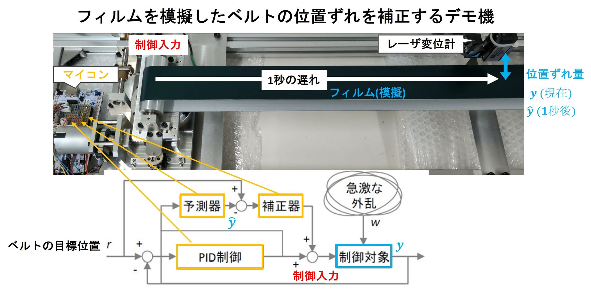本デモ機はウェブ搬送機に見立てており、回転するベルトの位置ずれを蛇行制御装置で補正しています。従来のPID制御で処理されている蛇行制御装置に、当社のAI技術を追加した「AI-PID」を適用することで、既存のPID制御と比較して外乱による位置ずれが改善され、補正精度も向上します。既存の制御方法を活かしながらAIを追加するため、これまで作り上げてきた制御システムはそのまま流用しつつ、より高精度な制御を実現します。また、AIが明らかに誤った値を示した場合、その結果を適用しないようにする機能も搭載しており、安全性も確保されています。この技術により、精度の向上だけでなく、信頼性の高い制御が可能となります。