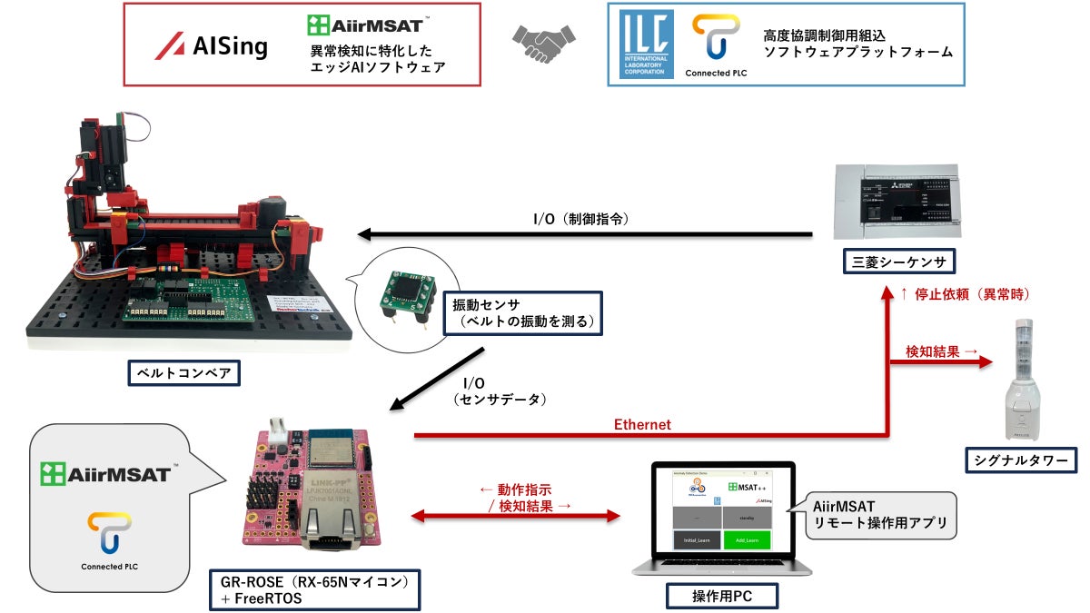 生産設備や製品におけるAI活用の一例として、ベルトコンベアの異常検知を想定したデモを展示いたします。ベルト動作時に物が挟まった際、マイコンに搭載した当社の異常検知向けAIアルゴリズム「AiirMSAT®」が、ベルトに取り付けた振動センサの情報をもとに異常度合いを検出します。さらに、株式会社アイ・エル・シーが保有する機器同士の通信を可能にする制御エンジン「Connected PLC」との連携により、AIによる異常検知の結果をシグナルタワーのランプで発報、およびPLCに対して異常通知を行います。このように、既存機器における、AIによる異常検知機能をレトロフィットし、異常検知後の機器制御にAI技術を活用することを実現します。