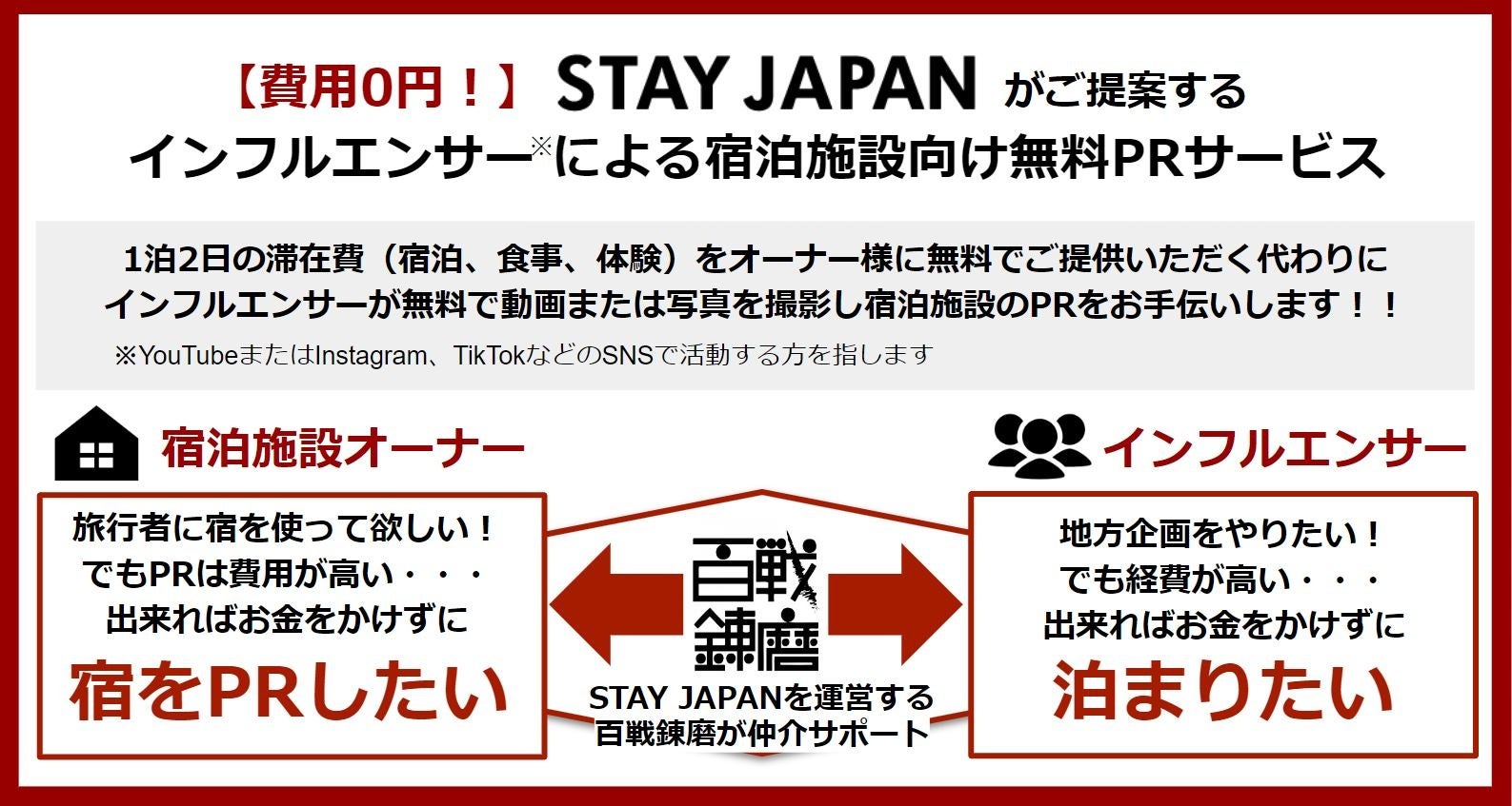 株式会社百戦錬磨(宮城県仙台市、代表取締役 上山康博)は、民泊、農泊、別荘泊、古民家泊、寺泊、城泊など日本各地の個性的な宿を掲載する宿泊予約サイト「STAY JAPAN(ステイジャパン)」(https://stayjapan.com/)において、インフルエンサー*に宿泊施設を無料でPRしていただく新サービスを開始いたしました。