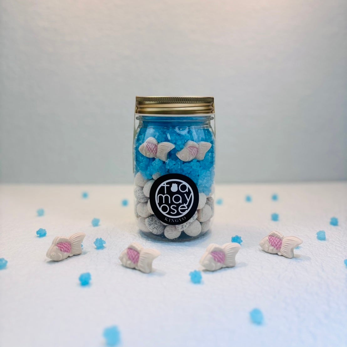 見た目もさわやかな、サイダー味の金平糖の中を、和三盆の金魚たちが並んで泳いでいるのがとっても可愛らしく、食べるのをためらってしまいそう…。