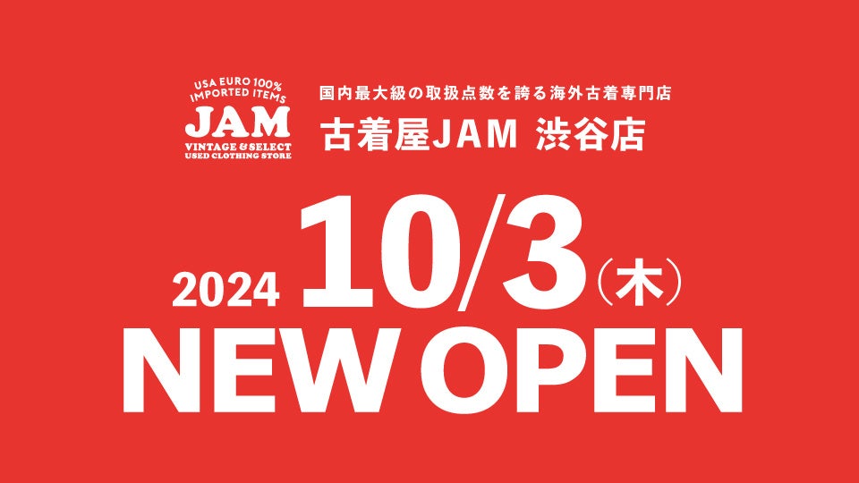 国内最大級の取扱点数を誇る海外古着専門店の「古着屋JAM(ジャム)」が、東京へ4店舗目となる「古着屋JAM 渋谷店」を2024年10月3日(木)にオープン。