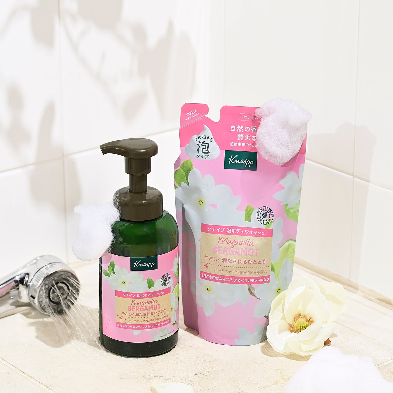 クナイプの「泡ボディウォッシュ」は、天然植物成分由来のきめ細やかなもちのよい濃密泡で身体をやさしく包んで洗う泡タイプのボディウォッシュ。自然なハーブの豊かな香りがワンランク上のシャワータイムを約束します。マグノリア&ベルガモットの香りは、甘さとフレッシュさを兼ね備えた上品で華やかなフローラルノート。まるで花々に包まれるような心地よさがバスルームいっぱいに広がり、癒しの時間を演出します。やさしくも華やかな香り立ちが、毎日のシャワータイムを格別なひとときへと変えてくれます。また、3種のオーガニック天然植物保湿成分を配合し、うるおいベールをまとったようなしっとり肌に洗い上げます。