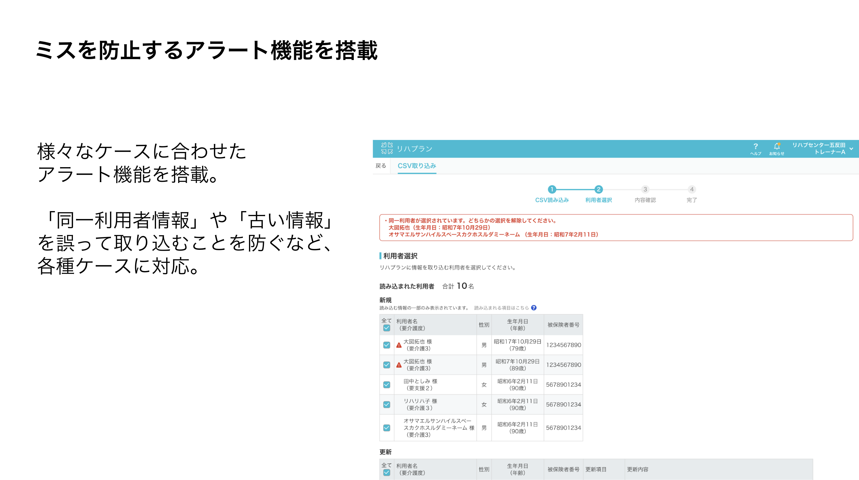 また、利用者の情報は取り込み前に確認・選択することができるため、予定していない利用者情報を誤って取り込む心配もありません。