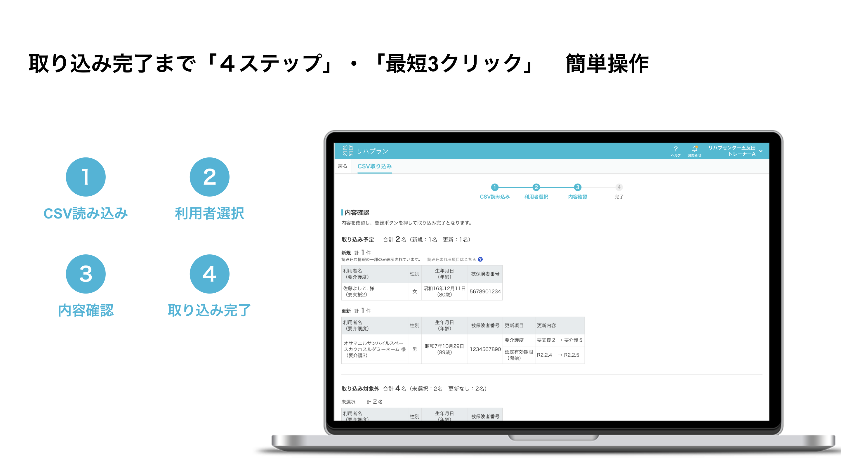 その様な背景から、各介護ソフトのLIFE用CSV出力機能を活用して、リハプランにそのCSVを取り込み、利用者情報の登録・更新をスムーズに行える機能の開発に至りました。