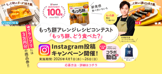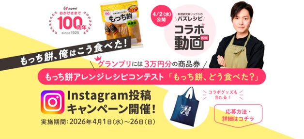 また、これに連動して、Instagramにて「もっち餅」を使用したアイデアレシピコンテストを開催します。「もっち餅」を使った多彩なアレンジレシピを募集し、応募作品の中から選ばれた受賞者には、商品券や「リュウジのバズレシピ×カネサダ」のオリジナルエコバッグなど豪華賞品をプレゼントします。