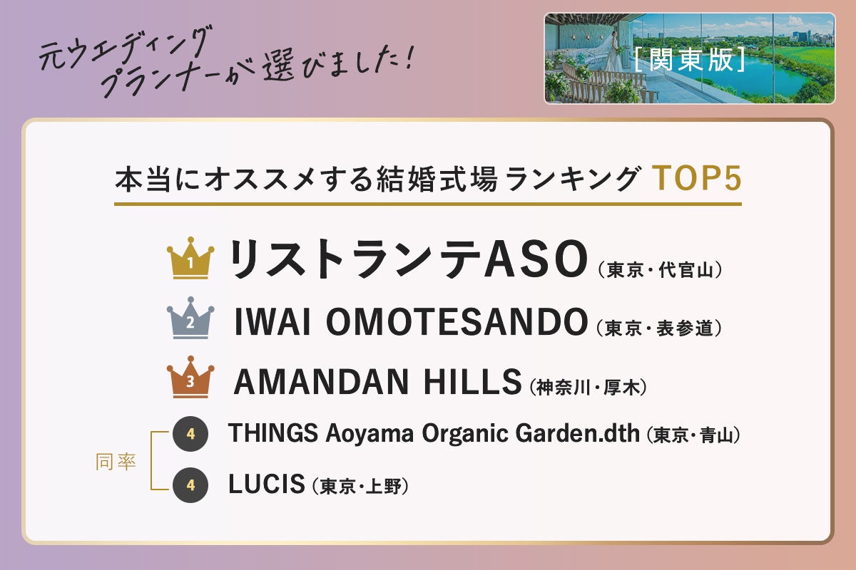 元ウエディングプランナーが選ぶ「本当にオススメする結婚式場ランキング<関東版>」を発表!