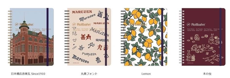 「日本橋店赤煉瓦」「丸善フォント」「Lemon」「本の虫」の4種類のデザインで「ロルバーン ポケット付メモ(Lサイズ)」と「5パーツホルダー」を展開