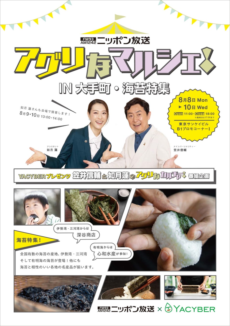 YACYBER株式会社(所在地:大阪府大阪市、代表取締役社長:唐澤太郎)は、株式会社ニッポン放送(所在地:東京都千代田区、代表取締役社長:檜原麻希)と連携し、東京都千代田区の東京サンケイビルSHOPS & RESTAURANTSのB1FプロモコーナーⅠにおいて「アグリなマルシェ!IN 大手町・海苔特集」を8月8日(月)〜10日(水)までの3日間、開催いたします。