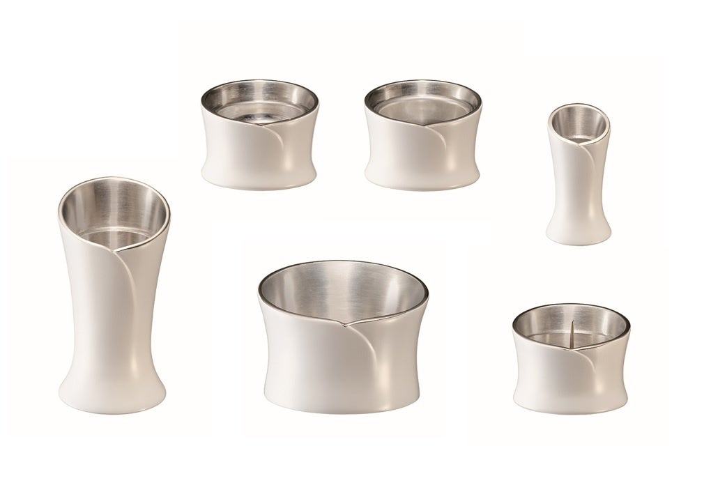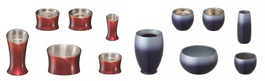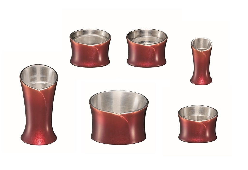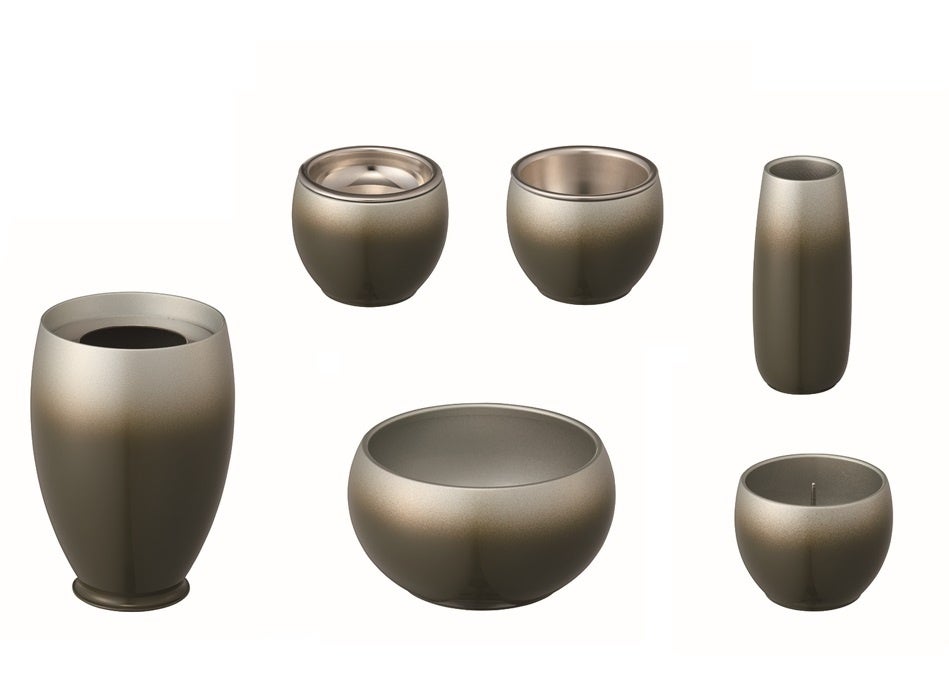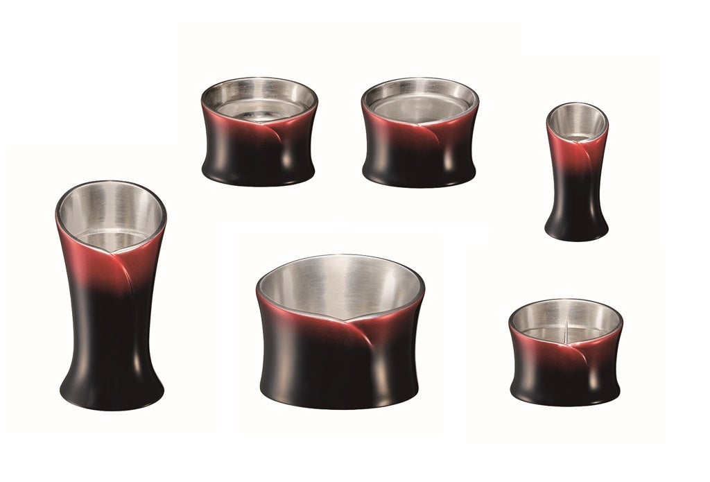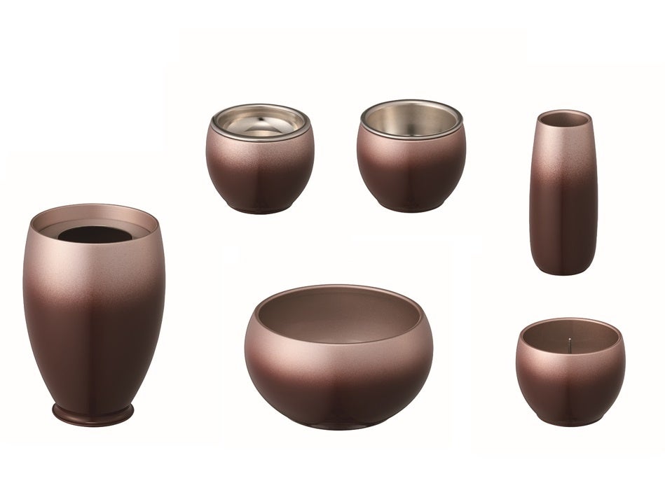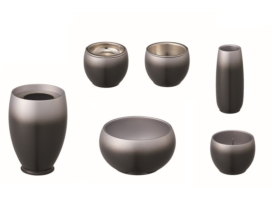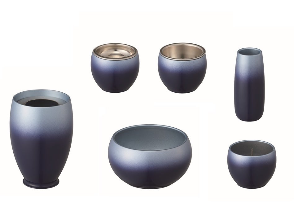 お仏具6点セット(香炉、花立、火立、線香差し、仏飯器、茶湯器)を2種類×4色展開でご用意しました。従来、お仏具は加工のしやすい真鍮の鋳造品が多かったのですが、今回の商品はサビに強く、品質の安定性にすぐれたステンレスを使用しました。