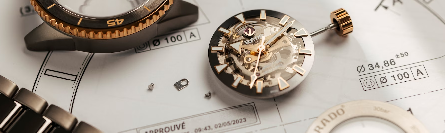 本来、ラドーでは永きにわたって、お客様にご利用いただけるよう、細心の注意を払って時計製造に携わってきました。「マテリアルの巨匠」として、新たな素材の開拓に日々取り組んでおり、耐傷性がある素材を積極的に開発するなどして取り組んでいるのは、「お客様にとって着用しやすい時計であるため」であり、ラドーの開発研究者たちの思いにつながっているという背景があってこそです。中でも、ハイテクセラミックを採用したケースとブレスレット、セラモス™、サファイアクリスタル、ステンレススチール、チタンなど、様々な素材はすべて、ラドーウォッチを駆動している洗練されたスイス製ムーブメントを包み込み保護しているのと同時に、美しい外装としても仕上げています。