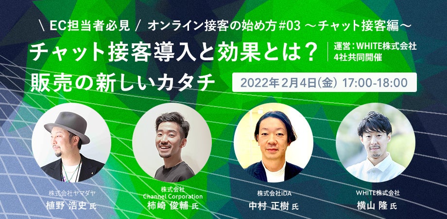 熱狂的ファンをつくる接客チャット「チャネルトーク」(株式会社Channel Corporation、所在地:東京都新宿区、CCO(Chief Customer Officer):坂本彩、以下「チャネルトーク」)は、2022年2月4日(金)17時00分より、デジタルトランスフォーメーションの支援事業を展開するWHITE株式会社、チャット接客人材の派遣/紹介を行う株式会社iDA、複数ブランドを展開する株式会社YAMADAYAと共同で『チャット接客導入と効果とは? ~販売の新しいカタチ~』をテーマにウェビナー開催することをお知らせいたします。