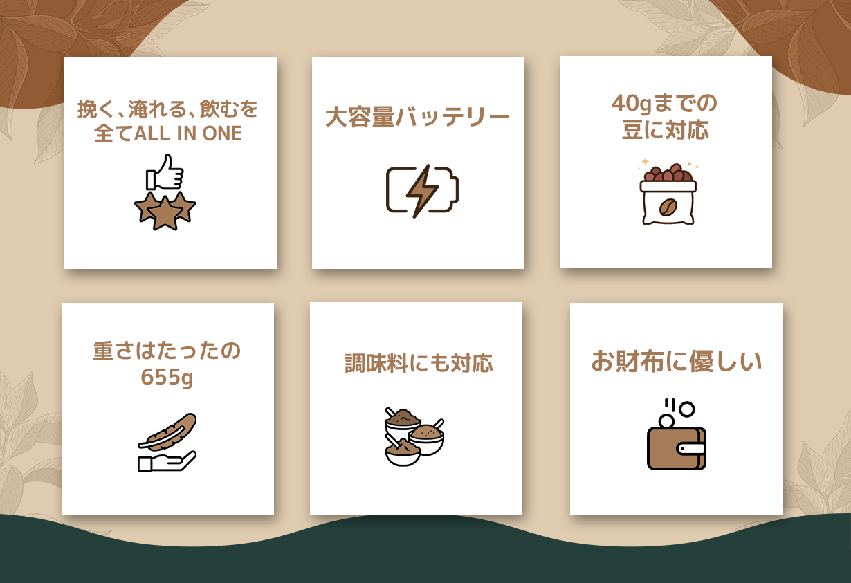 また、大容量バッテリーのおかげでパワフルに豆(10-15g)を挽けるので豆を挽くのにかかる時間はたった1分!時短で淹れたてのコーヒーを楽しめます!