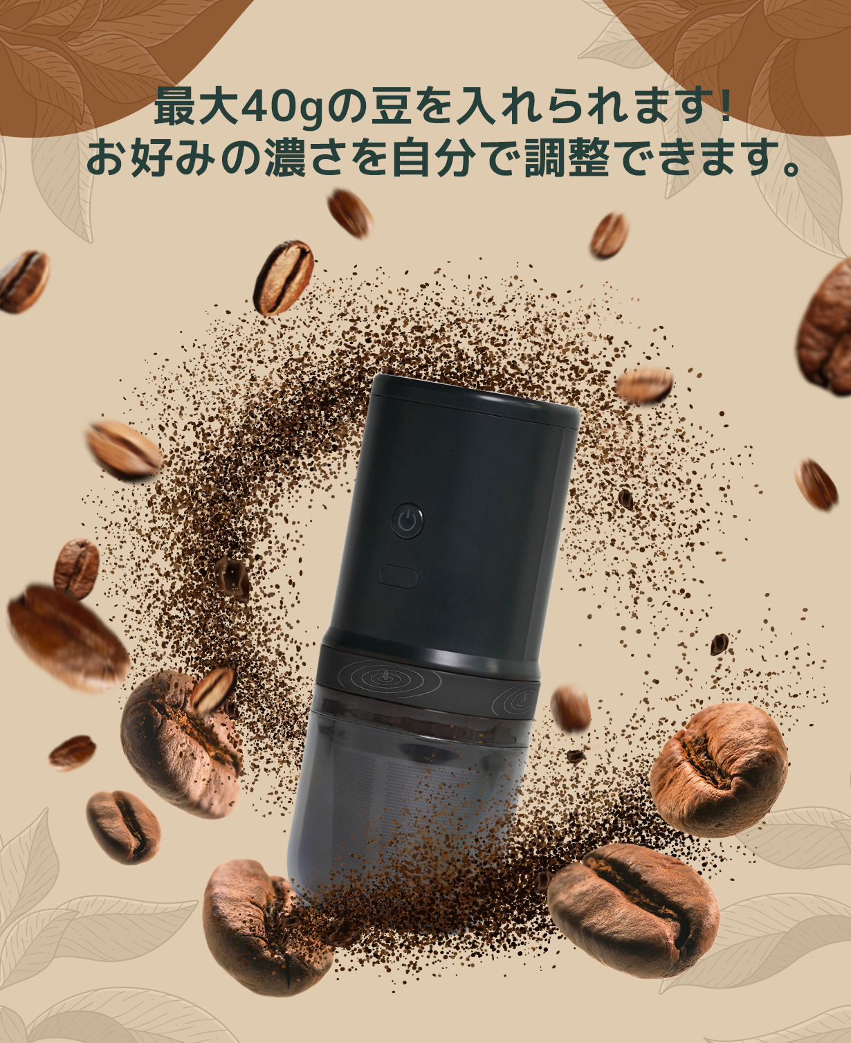 最大40gの豆を挽くことができるので、その日の気分に合わせて、お好みの濃さを調整できます。