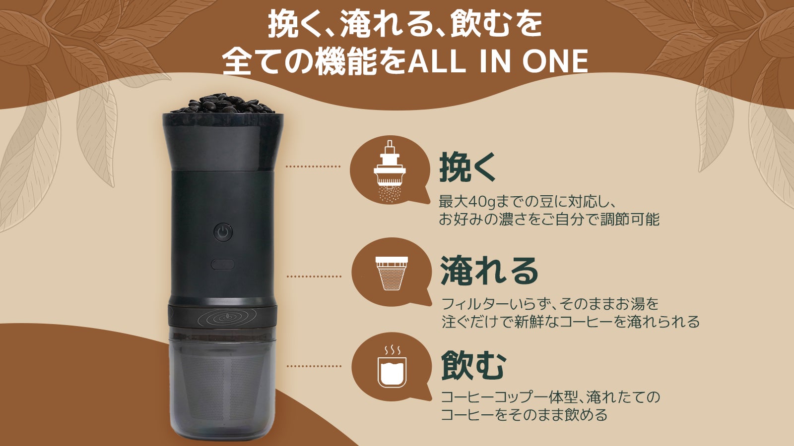 コーヒー豆を最大40gまで挽く、淹れる、飲むを全てこの一台で実現。コーヒーだけではなく、自作調味料も作れる2wayコーヒーメーカー。法人向け卸サービスも相談受付中。