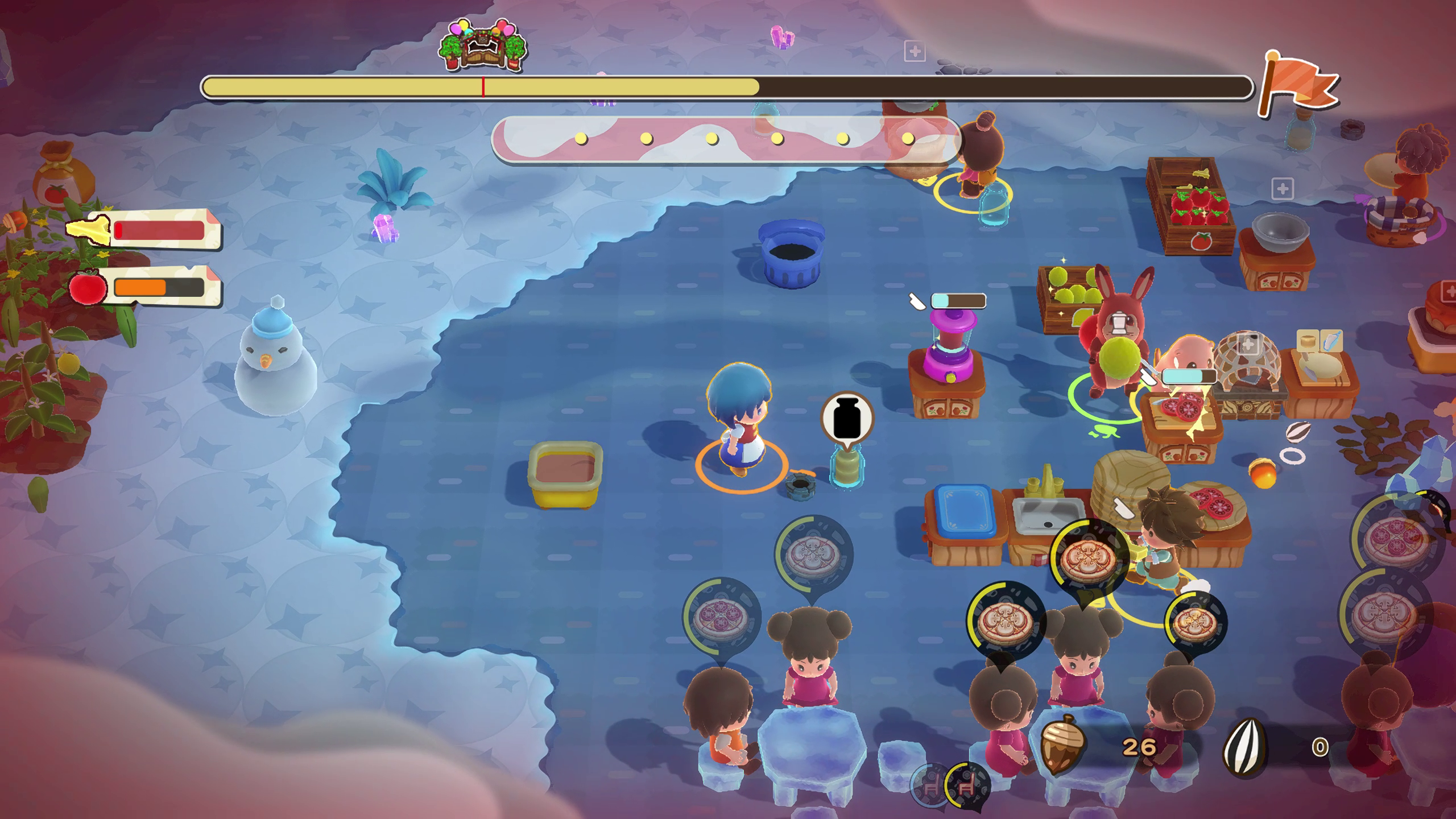 ハプニングだらけのドタバタクッキング体験ができる「みんなでレストラン」モード。プレイヤーは「キッチン」「ホール」「ファーマー」「トレジャー」に分かれて協力!食材集め、料理作成、お客さんへお届け、 ホールの掃除やペットのお世話も待ち受けます!