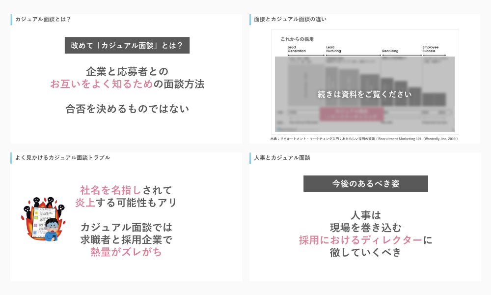 本セミナーでは、実際に弊社の採用支援において、カジュアル面談からの応募率が20%から80%までアップした「カジュアル面談の極意」をご紹介。カジュアル面談から採用に繋げたい、面談をなんとなくやってしまっている、現場メンバーのカジュアル面談が不安だという方々を中心に多数ご参加いただきました。