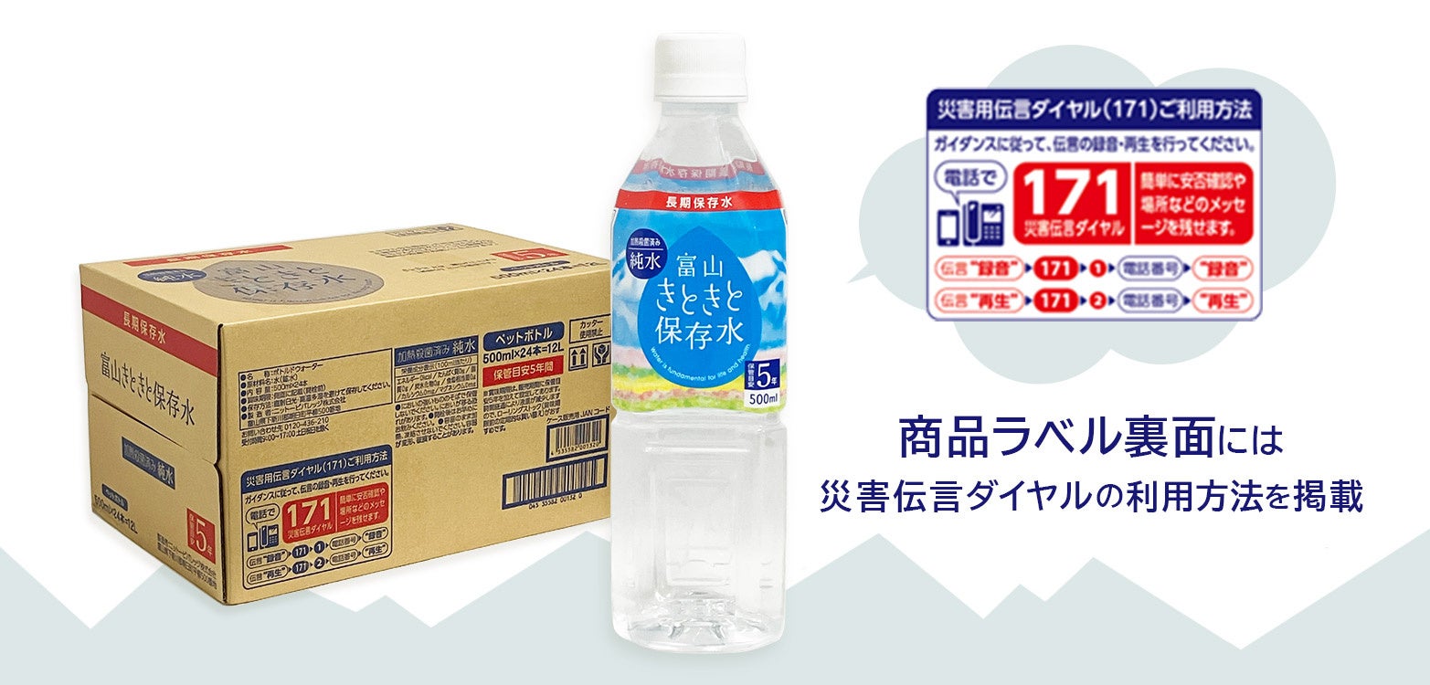 パッケージは、表面上部に一目で備蓄品とわかるよう「長期保存水」と記載し、裏面に災害時にご活用いただけるよう、災害伝言ダイヤルの利用方法を記載しております。また、デザインは災害時・非常時こそ心を落ち着かせて欲しいとの願いから、ラベルの背景に穏やかな富山の春の景色のイラストを採用しました。