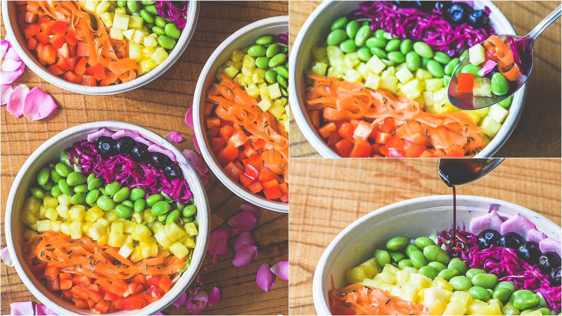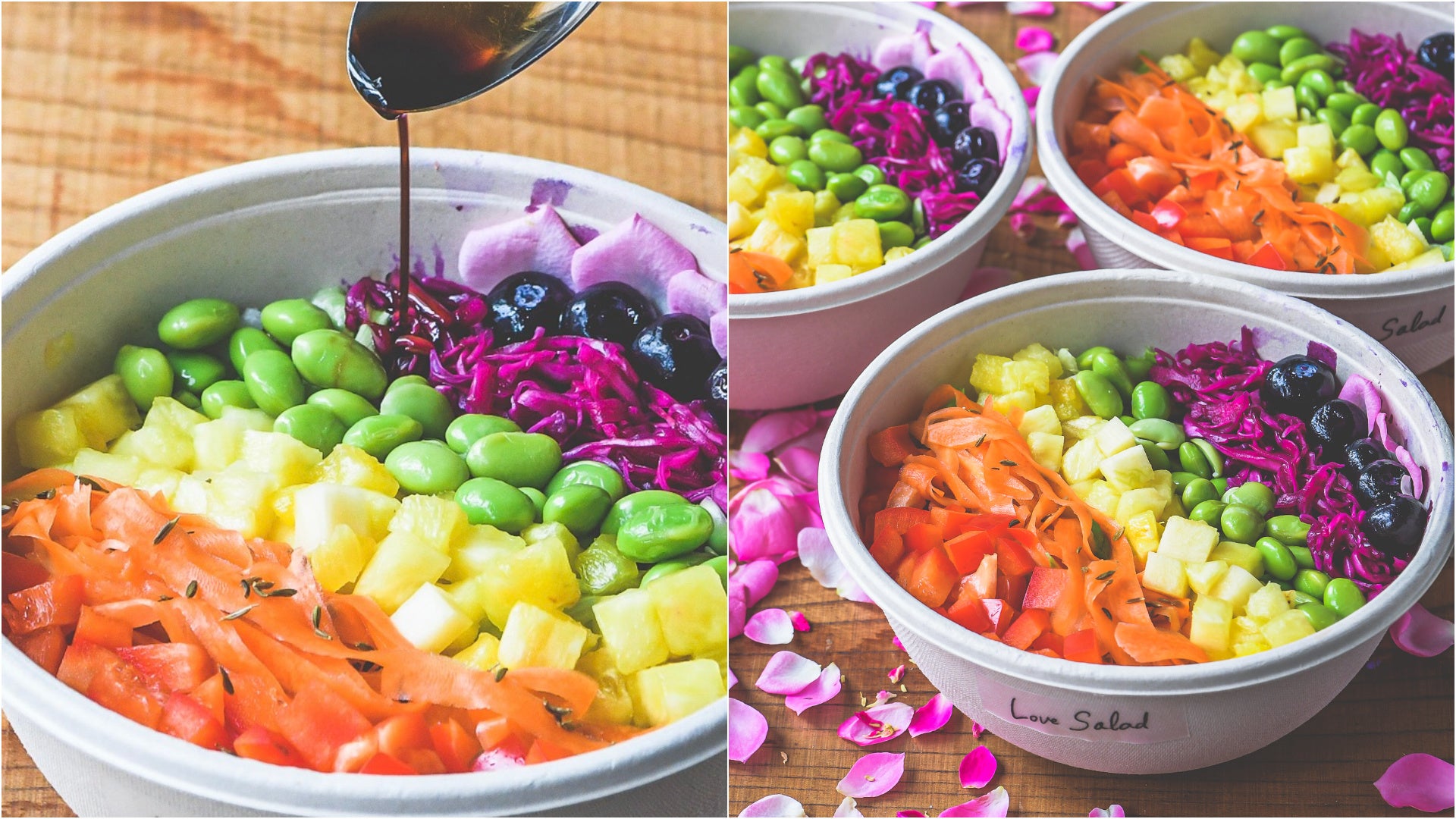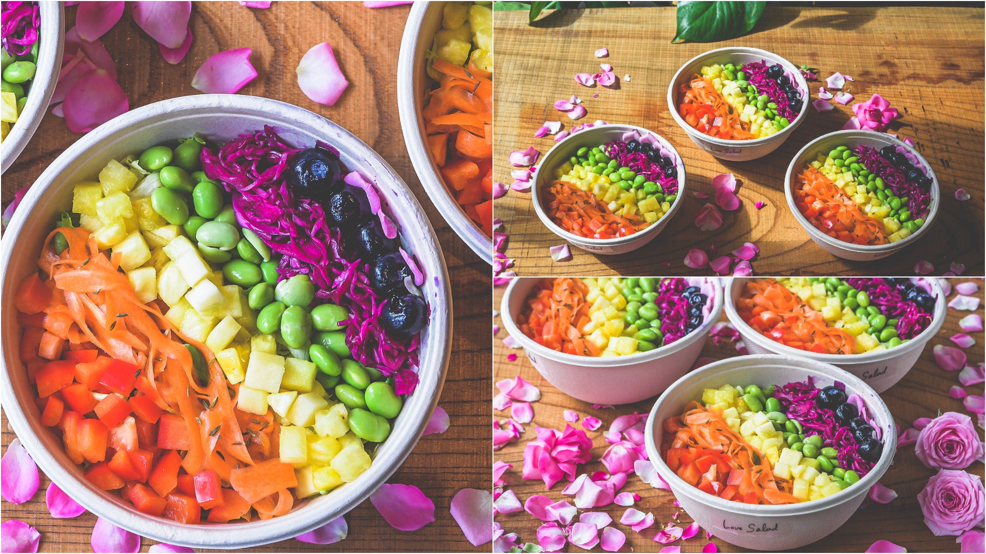 創造的であたらしい花食体験「美味しい花体験」の創作に取り組むエディブルフラワー研究所。花のポテンシャルを最大限に引き出した「飾り以外」の創造性を追い求めて、各業界のトップクリエイターと連続的にコラボレーションを展開します。今回は創造的で美しいサラダがSNSを中心に人気のLove Saladとのコラボレーション。生のバラを美味しく味わっていただくことにこだわり抜いたサラダが完成しました。シャキシャキのレタスの上に、ブルーベリー、紫キャベツのラぺ、枝豆、パイナップル、キャロットラぺ、パプリカをのせ、ブルーベリーのサイドに、ピンクのバラ(オーバーナイトセンセーション)をあしらい、見た目も味わいも「虹色」になるように設計した『薔薇とフルーツのレインボーサラダ』です。