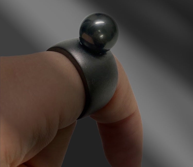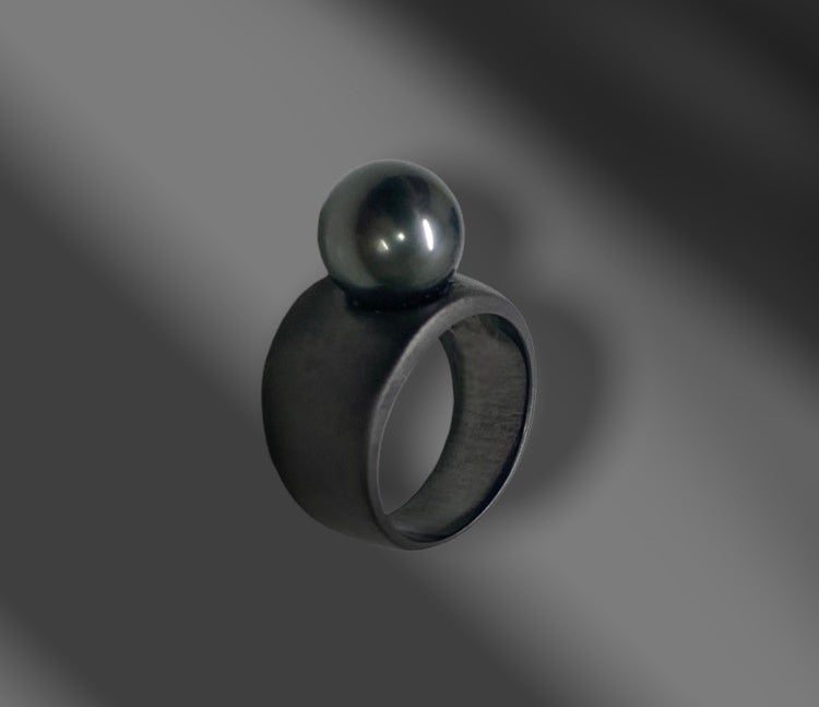 「メンズにも大珠真珠を気軽に、かっこよく身に付けてほしい」という思いから、マルゴリングを大胆にマットブラックメッキを施し、質の良い10㎜のブラックパールをあしらいました。