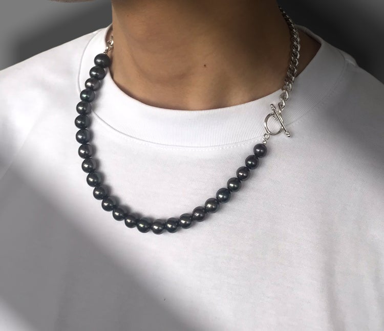 ホワイトカラーでは取り入れづらいサイズ感のパールも、ブラックならゴージャスになりすぎずエッジを効かせられます。首元の印象を華やかにして真珠の魅力を取り入れることで、洗練された大人の男性の雰囲気に。