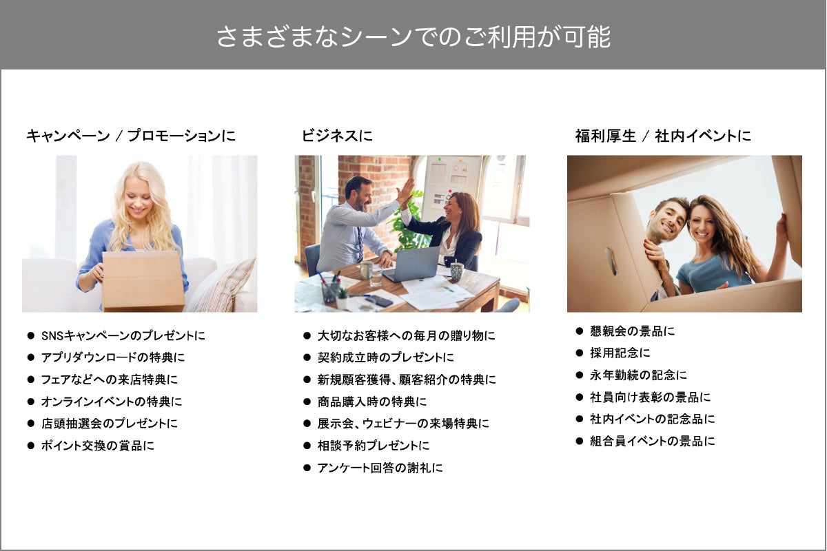 企業のキャンペーン用賞品や、福利厚生としての従業員向けギフトなど、多様な目的に応じてご提案いたします。