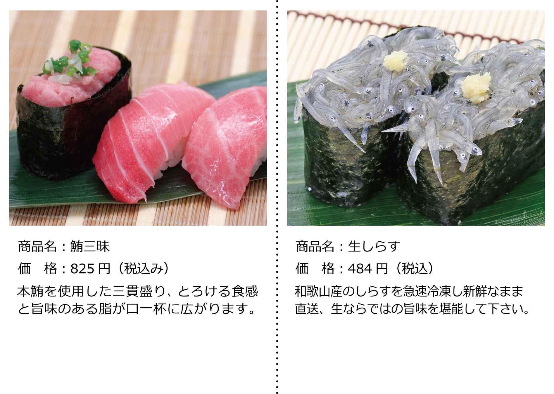 「海の幸の宝庫」和歌山のご当地グルメ“マグロ”や“しらす”のほか、全国各地から仕入れた絶品の寿司をぜひご賞味ください 。シャリには和歌⼭県産の米を使用し、オリジナルの⾚酢で仕上げるこだわりの回転寿司店です。