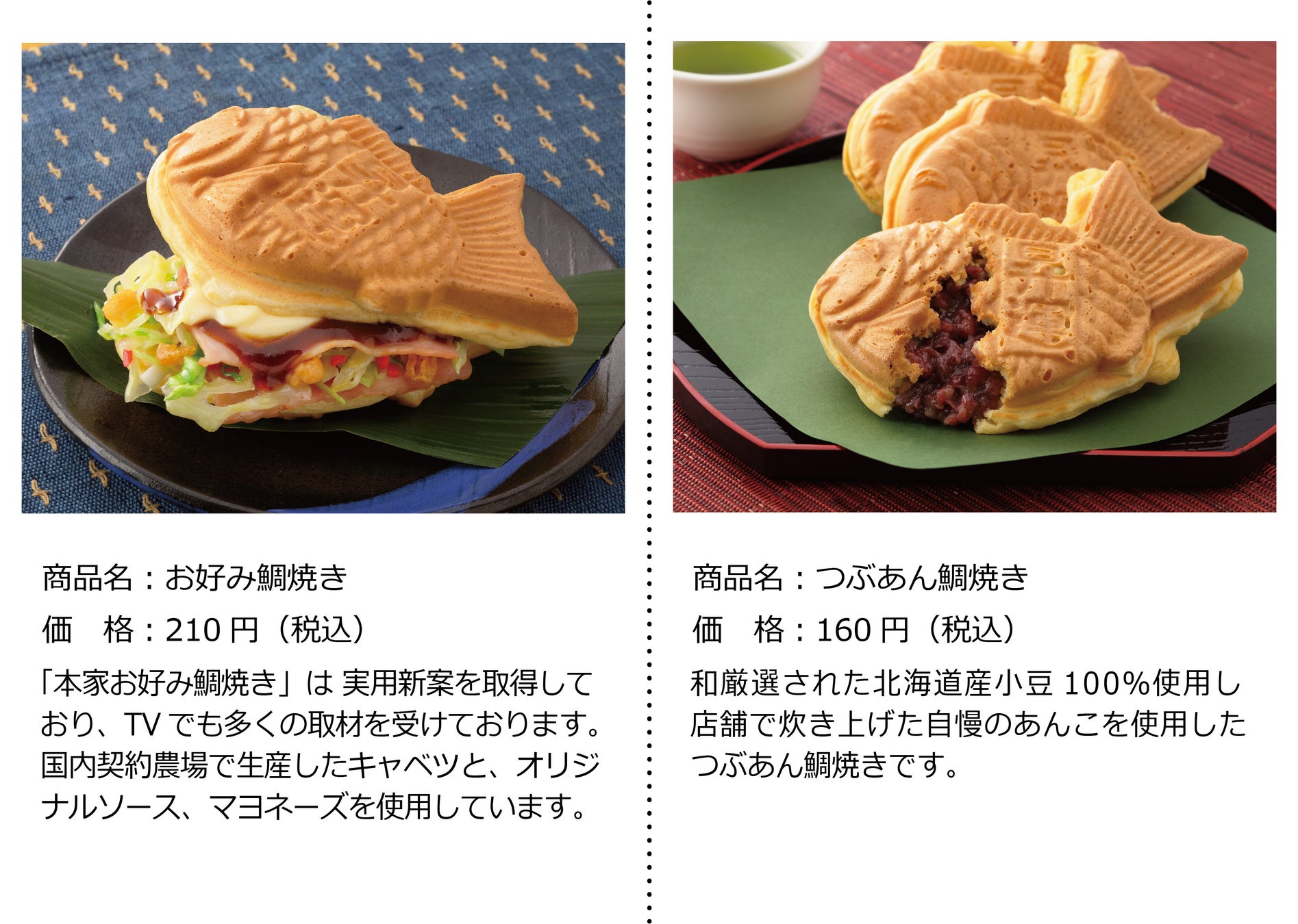 生地は冷めてもおいしいふっくら仕立て。あんこは厳選北海道産小豆100%、頭の先からしっぽの先まであんこたっぷり。一番人気『お好み鯛焼き』は特製ベーコンとオリジナルソース、新鮮キャベツをたっぷりはさんだ人気メニュー。