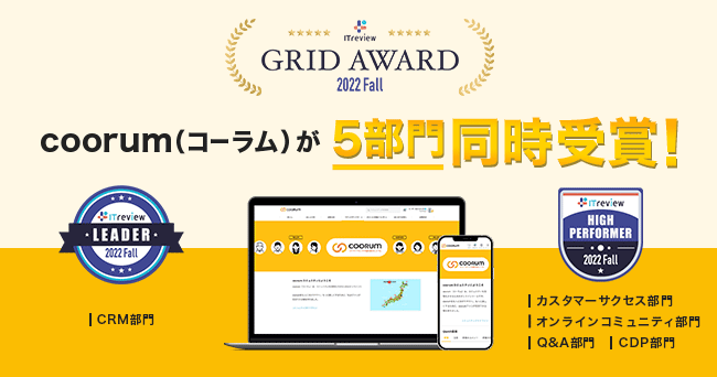 【5部門受賞】ロイヤル顧客プラットフォーム「coorum」が「ITreview Grid Award 2022 Fall」にて5部門同時受賞
