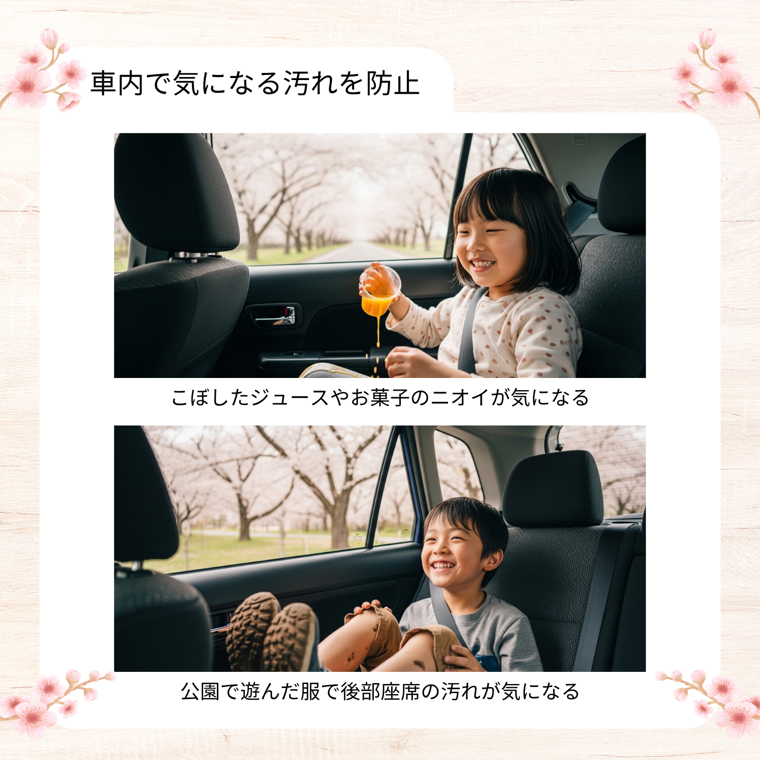 春は、お花見やレジャー、帰省などで家族やペットと車で移動する機会が増える一方、車内の汚れが気になりやすい季節でもあります。小さな子どもが後部座席でお菓子やジュースをこぼしてしまったり、公園やグラウンド帰りに泥や砂を車内に持ち込んでしまったりと、日常のなかで車内は少しずつ汚れていきます。