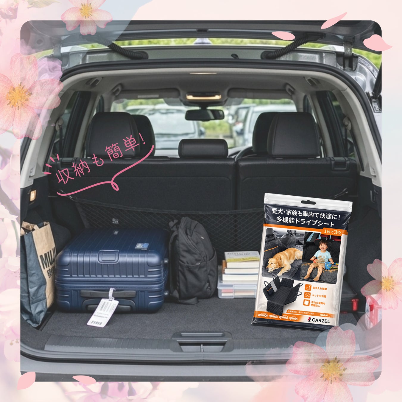後部座席にもトランクにも使える2WAY仕様のCARZELドライブシート。春のおでかけシーズンに合わせ、期間限定10%OFFキャンペーンを開始