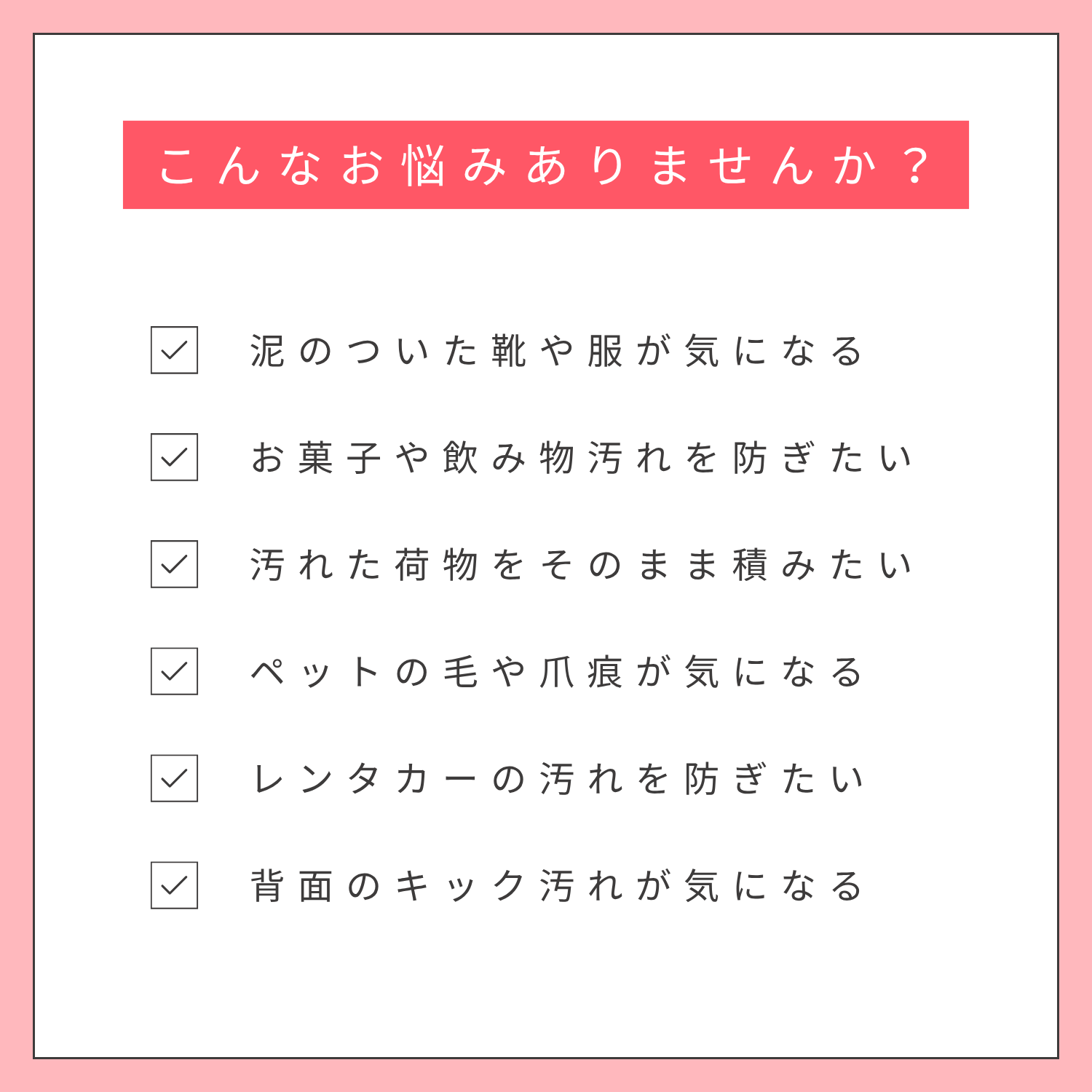 さらに、レンタカーやカーシェアを利用する方にとっては、返却時の汚れやシミによる追加料金への不安も見逃せません。子供やペットとのお出かけでは想定外のことが起きることも多いでしょう。